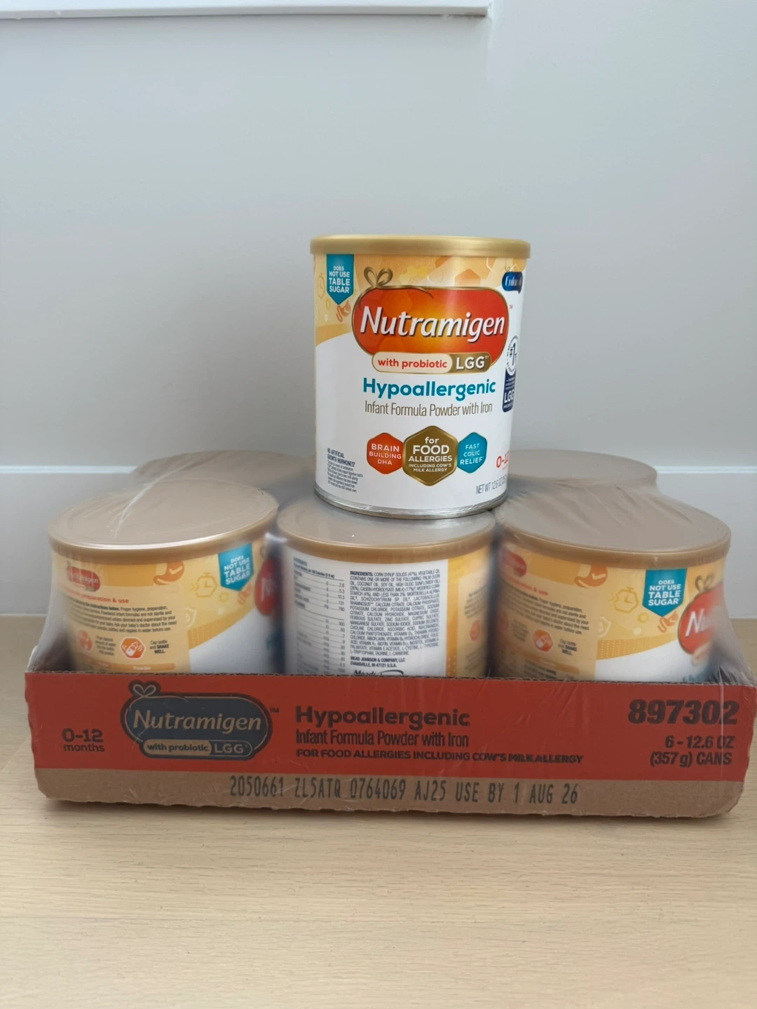 1 can of Nutramigen Hypoallergenic Infant Formula cans. Each can contains 12.6 oz (357g) of powder with probiotic LGG, designed for babies 0-12 months with cow's milk allergy. Expiration date is 2026 August 01