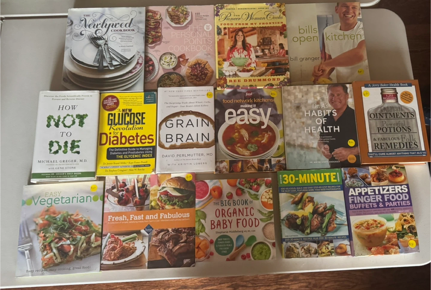 Selling a collection of cookbooks covering various topics! Titles include: - The Newlywed Cookbook - The Personal Points Cookbook - The Pioneer Woman Cooks: Food From My Frontier - Bills Open Kitchen - How Not to Die by Michael Greger, M.D. - The New Glucose Revolution - Grain Brain by David Perlmutter, MD - Food Network Kitchens Making It Easy - Dr. A's Habits of Health - Oddball Ointments, Powerful Potions & Fabulous Folk Remedies - Easy Vegetarian - Fresh, Fast and Fabulous - The Big Book of Organic Baby Food - 30-Minute Cookbook - Appetizers Finger Food Buffets & Parties