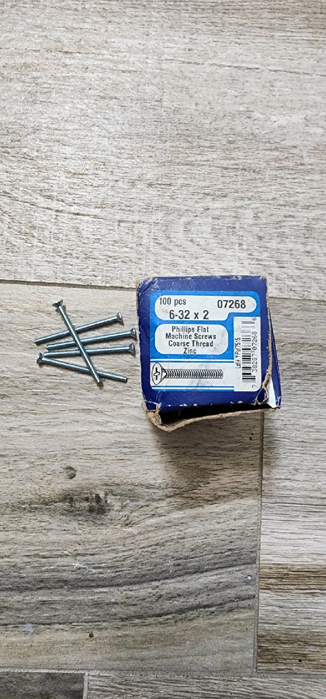 1000+Selling a box of Phillips Flat Machine Screws. It contains 100 pieces of 6-32 x 2 screws. They have a coarse thread and are made of zinc