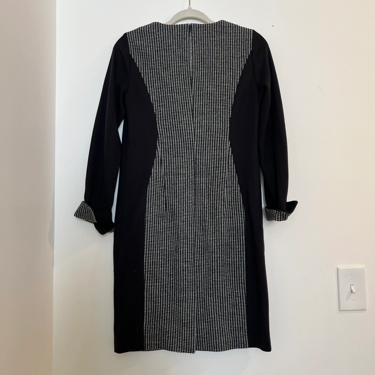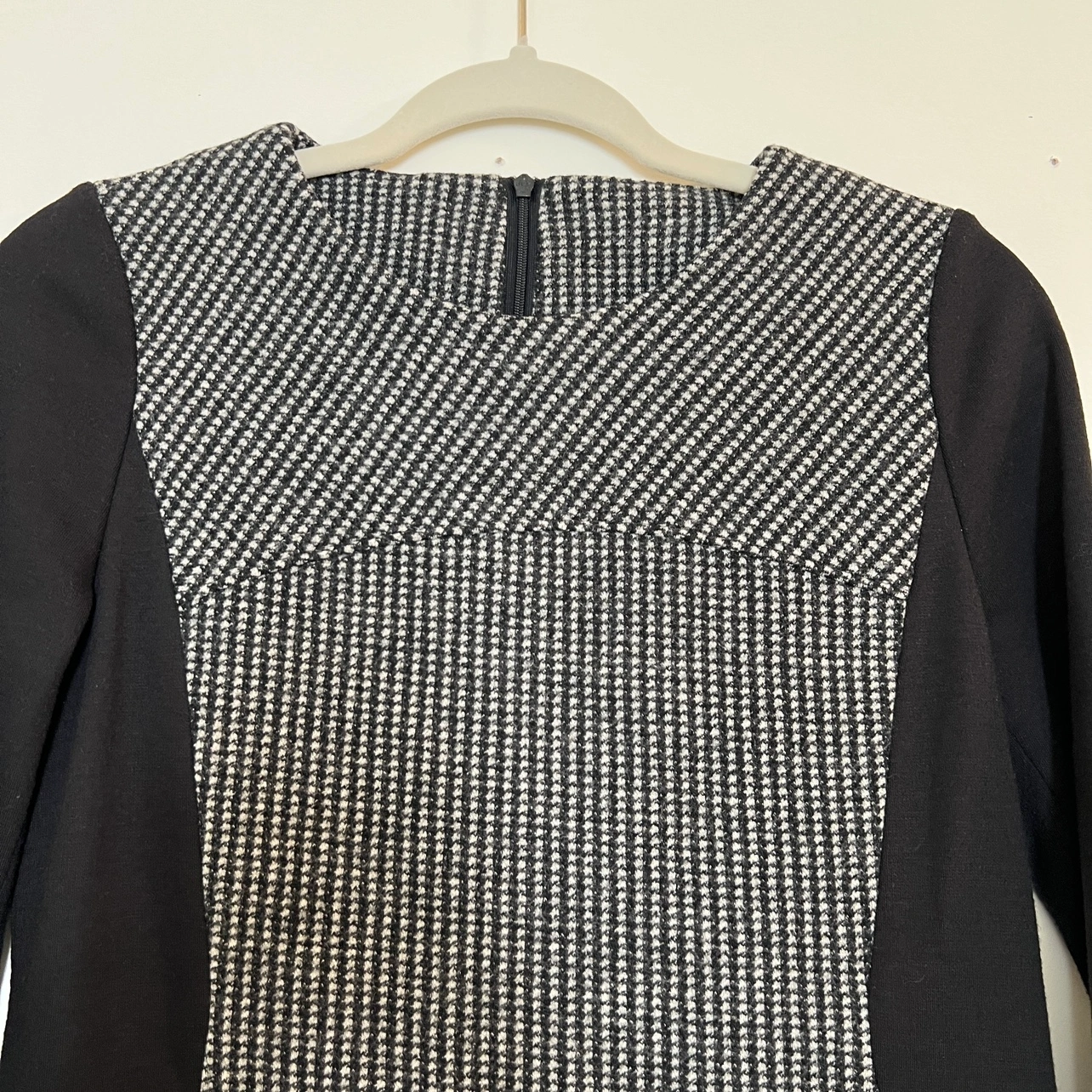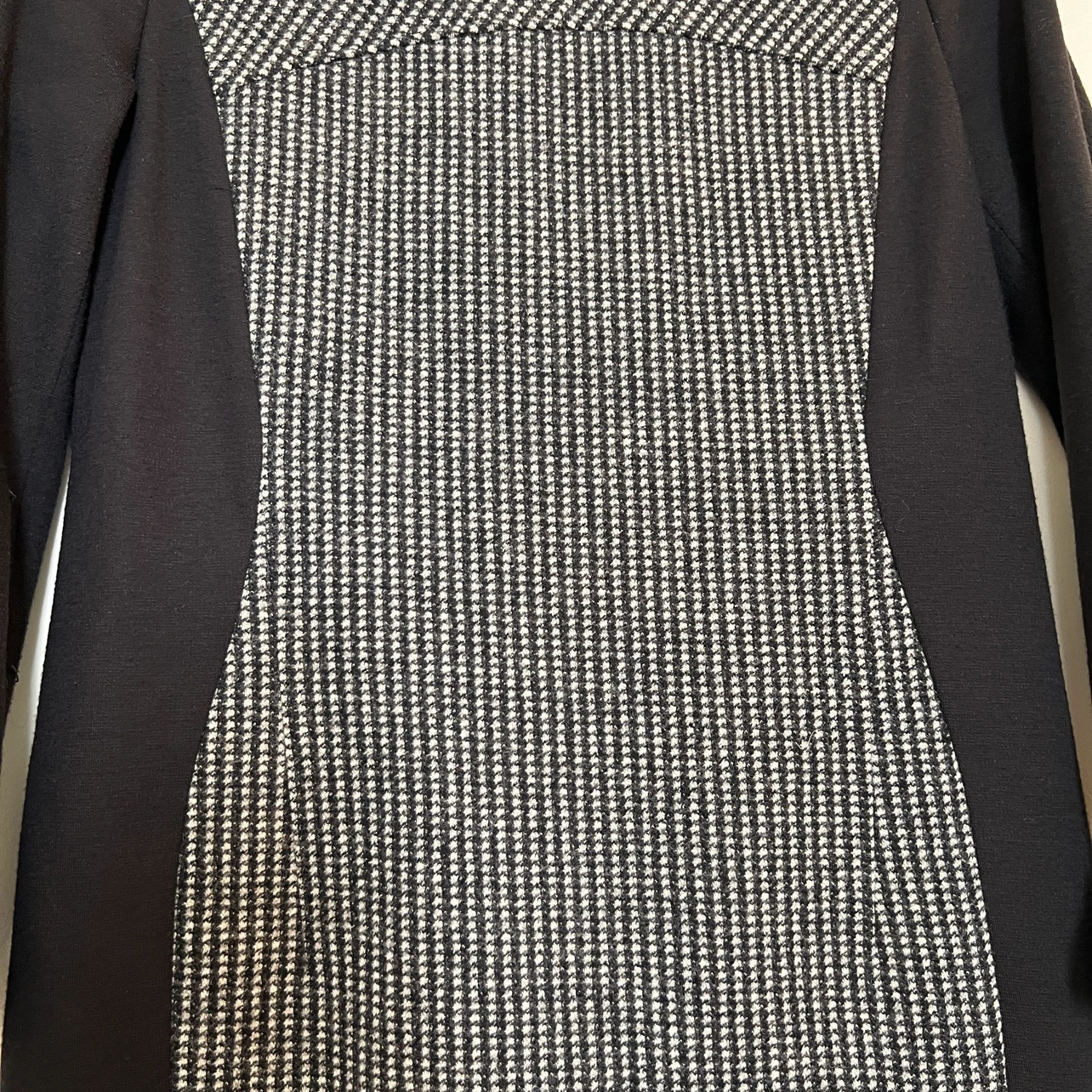Stunning black and white houndstooth dress with long sleeves and a fitted silhouette. The round neckline adds a touch of classic elegance, while the cuffs feature the same chic houndstooth pattern. Crafted from 100% high-quality wool for a luxurious feel and lasting durability. The dress zips up the back for a sleek finish. Size 2 will have a relaxed fit, while Size 4 offers a true-to-size fit. In excellent condition, like new • Dress Shoulder: 14.2in Bust: 17.3in Sleeve Length: 21.3in Waist Size: 16.1in Hip Size: 17.7in Length: 36.6in