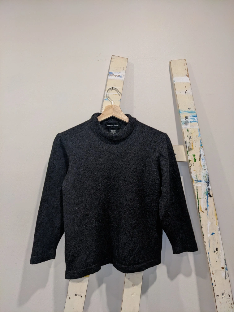 Really nice charcoal turtleneck with a bit of a cropped fit. No visible flaws. Tagged L, but has shrunk and now fits more like an S, perhaps a women's M? Measurements available!