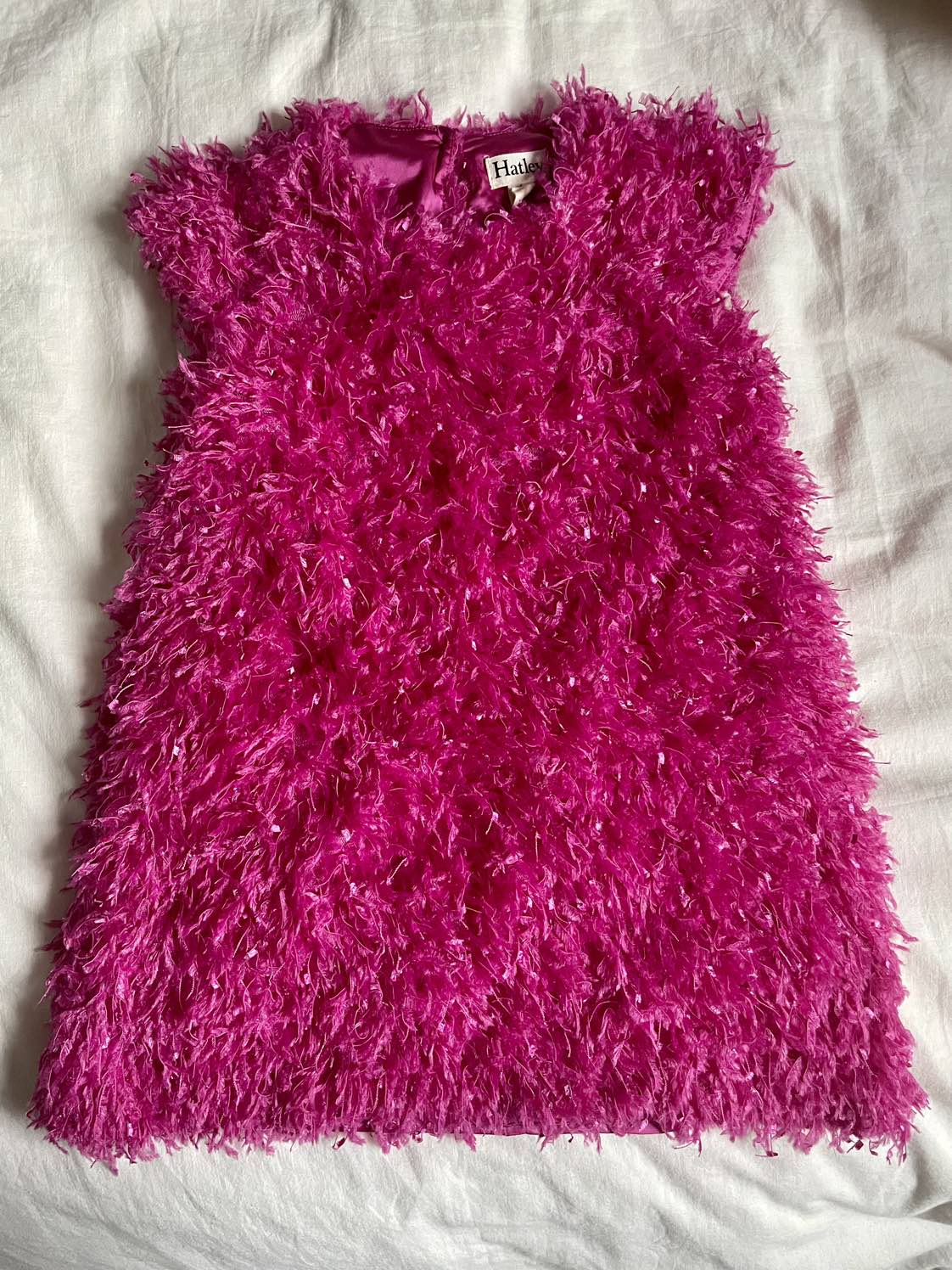 Hatley size 4 pink party dress. The beautiful pink muppet like fabric sheds a bid, but it doesn’t take away from being adorable to adult and pet-able to children. No stains or rips. Smoke free and pet free home.