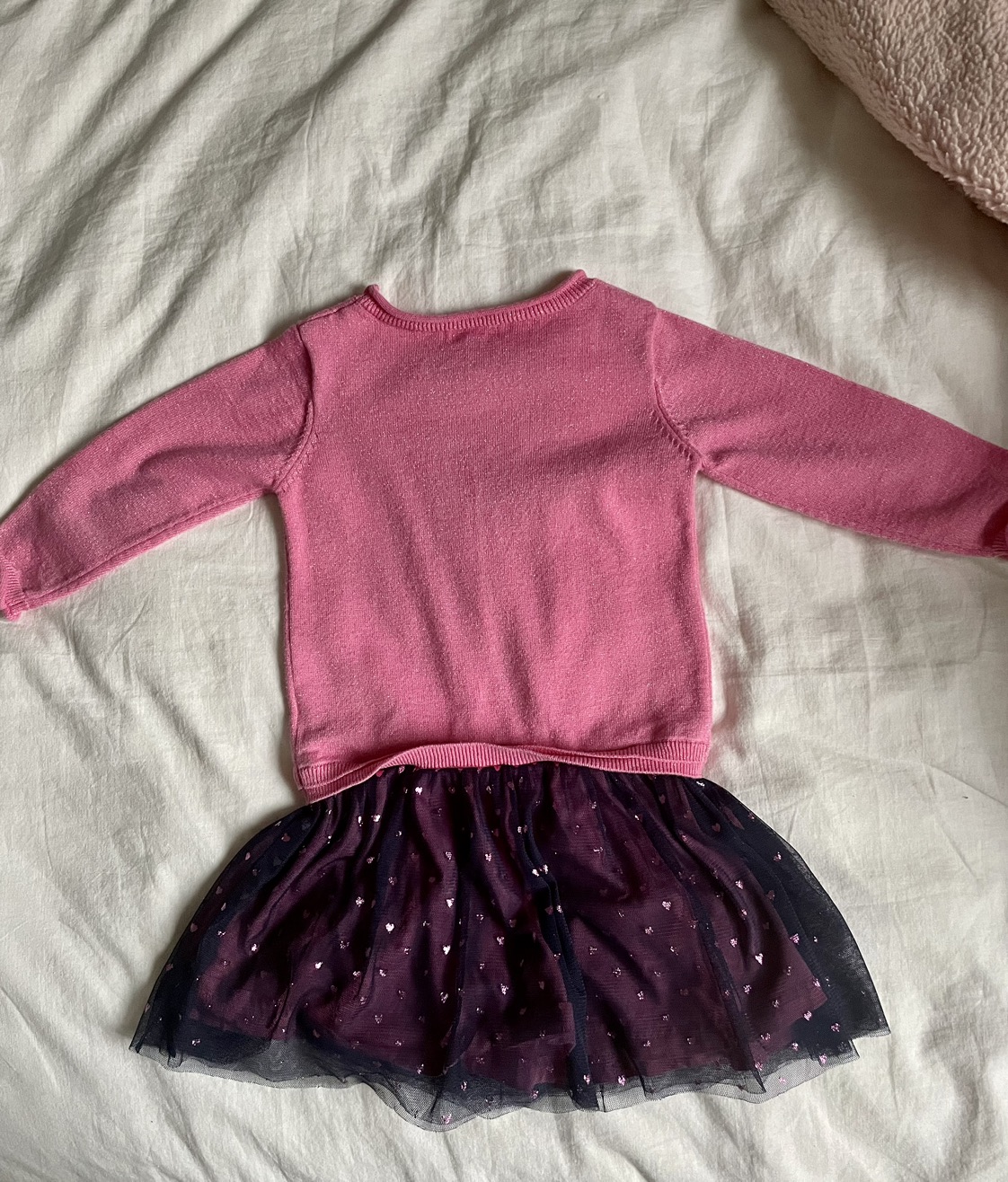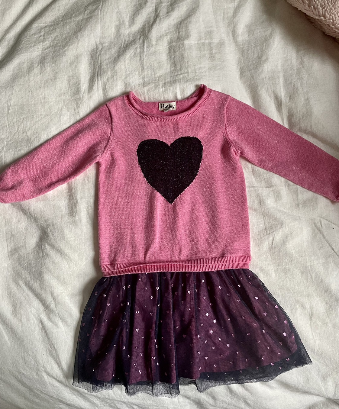 Hatley size 4 pink and navy blue weather dress. No stains but a bit of pull on the fabric near the heart. Not noticeable unless closely inspected. Perfect for a fancy fall! Smoke free and pet free home