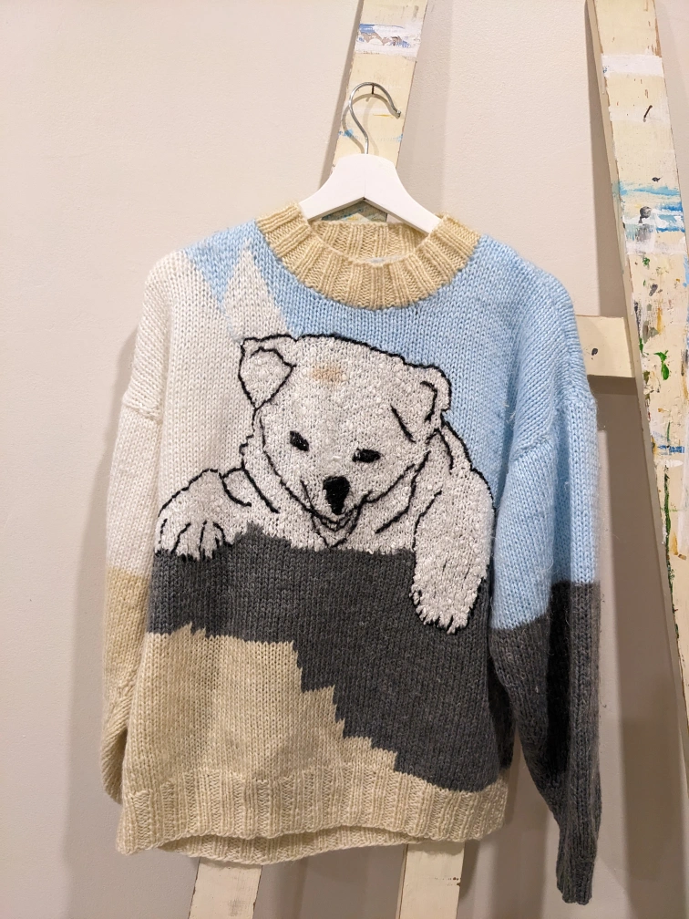 Pastel colors cover this thick sweater, with a cute polar bear on the front and the word "icy" on the back. Nice and warm, but still wearable during the Fall.
