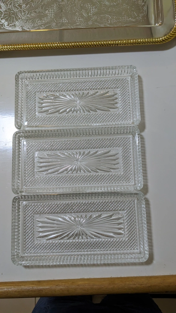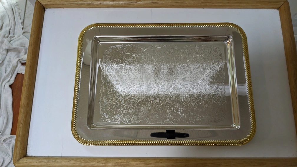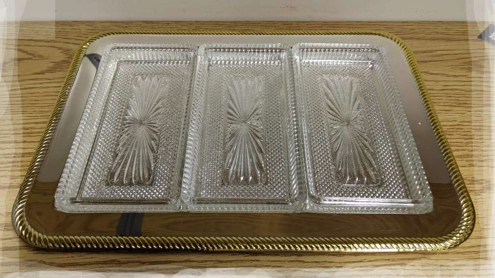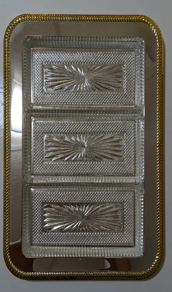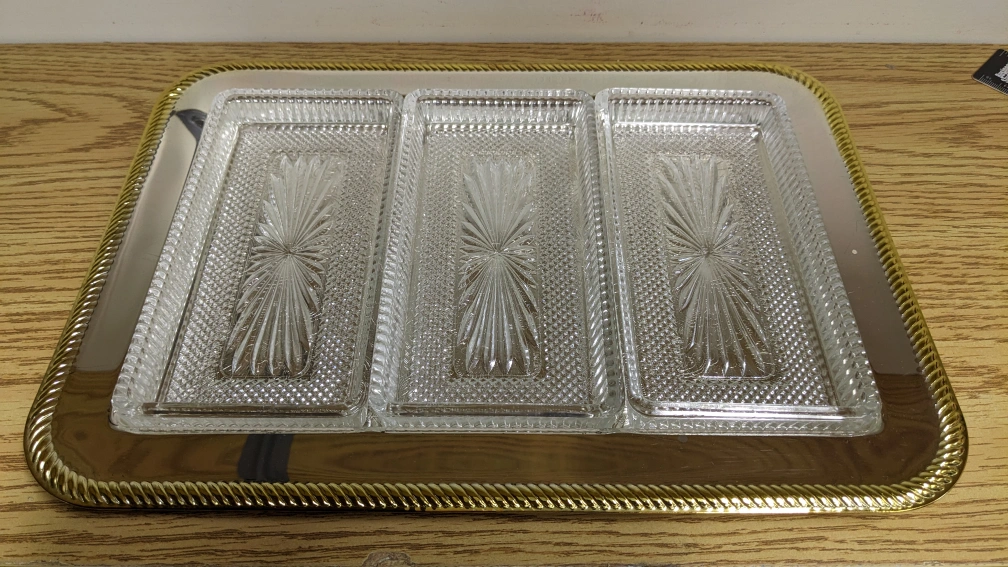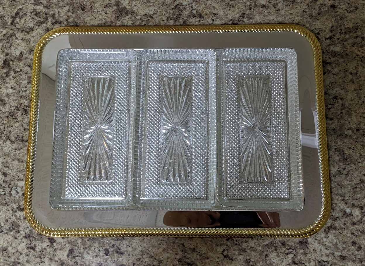 13" x 9" Vintage new silver plate two tone serving tray with removable crystal dishes.