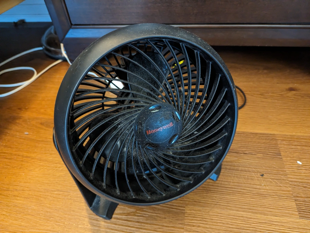 Honeywell fan. Adjustable angle, with hi vs lo fan setting. Works super well, and the high fan setting is quite strong!