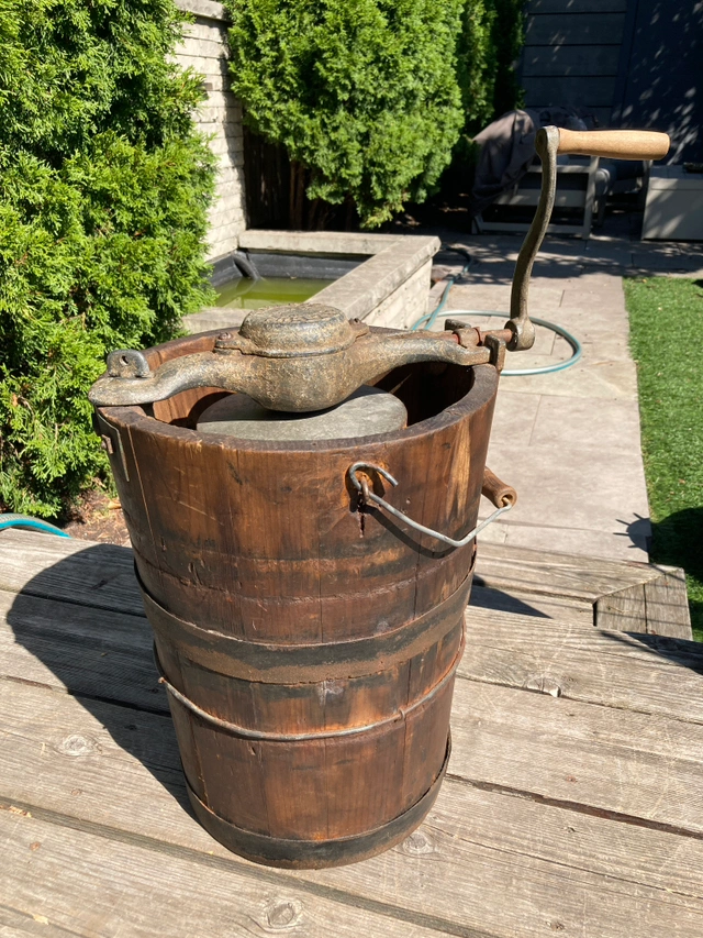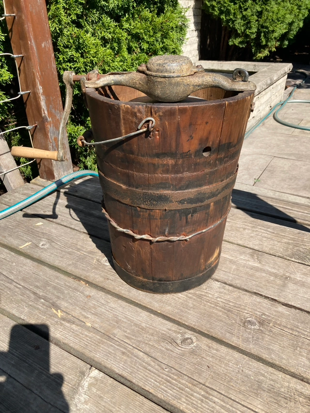 Great look to this complete piece. Consists of the wooden bucket with brackets on top and a spindle on the bottom, the metal cylinder that holds the ingredients and turns, and the crank with handle that slots into the top. The crank turns and the cylinder spins as it should.