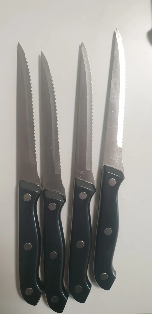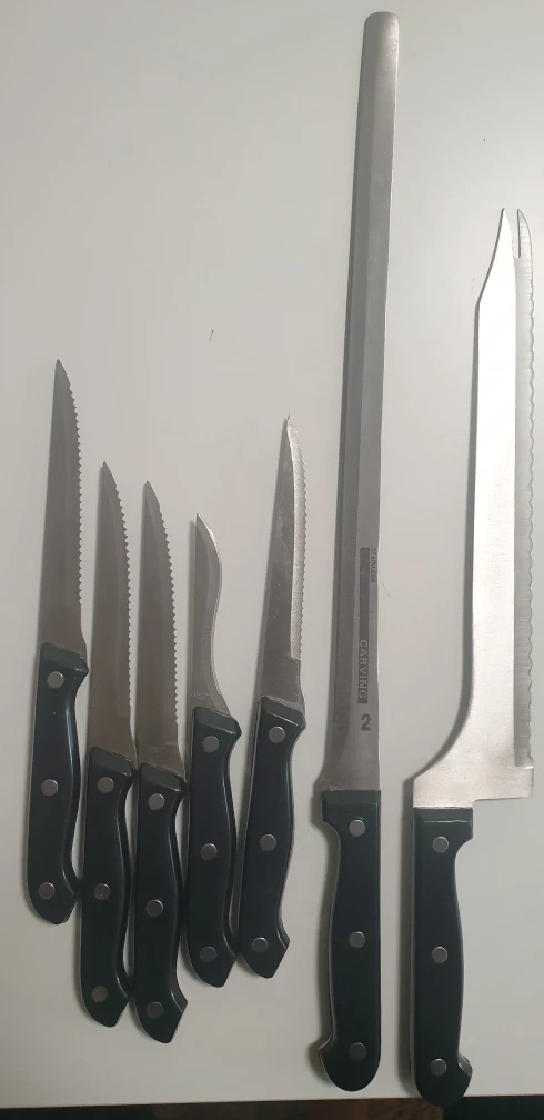 New knives, never used. A set of 4 steak knives, 1 carving knife, 1 garnish knife and 1 'showtime' knife.