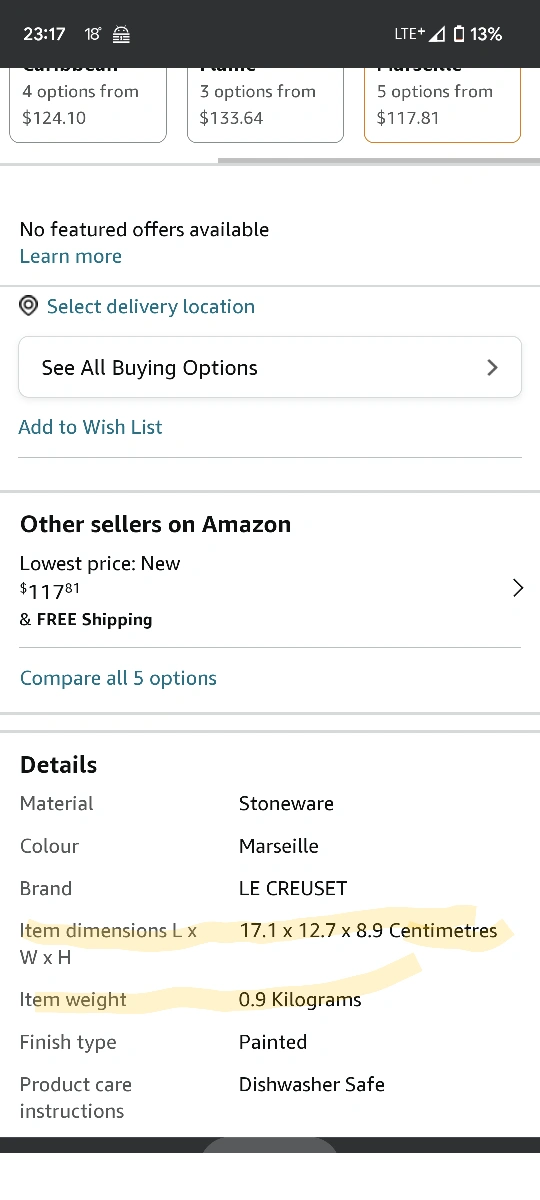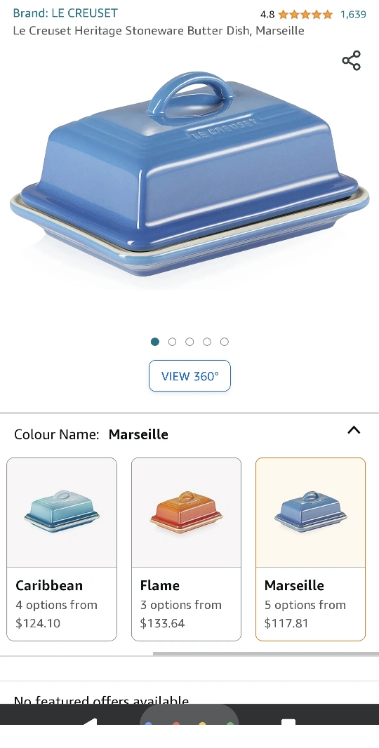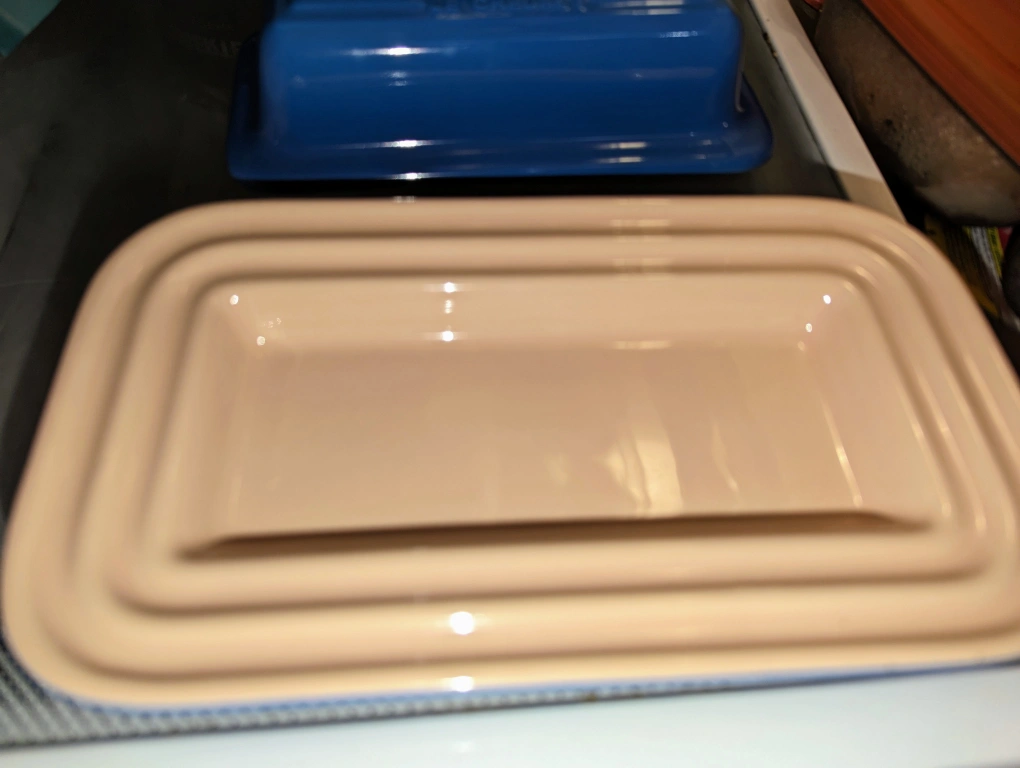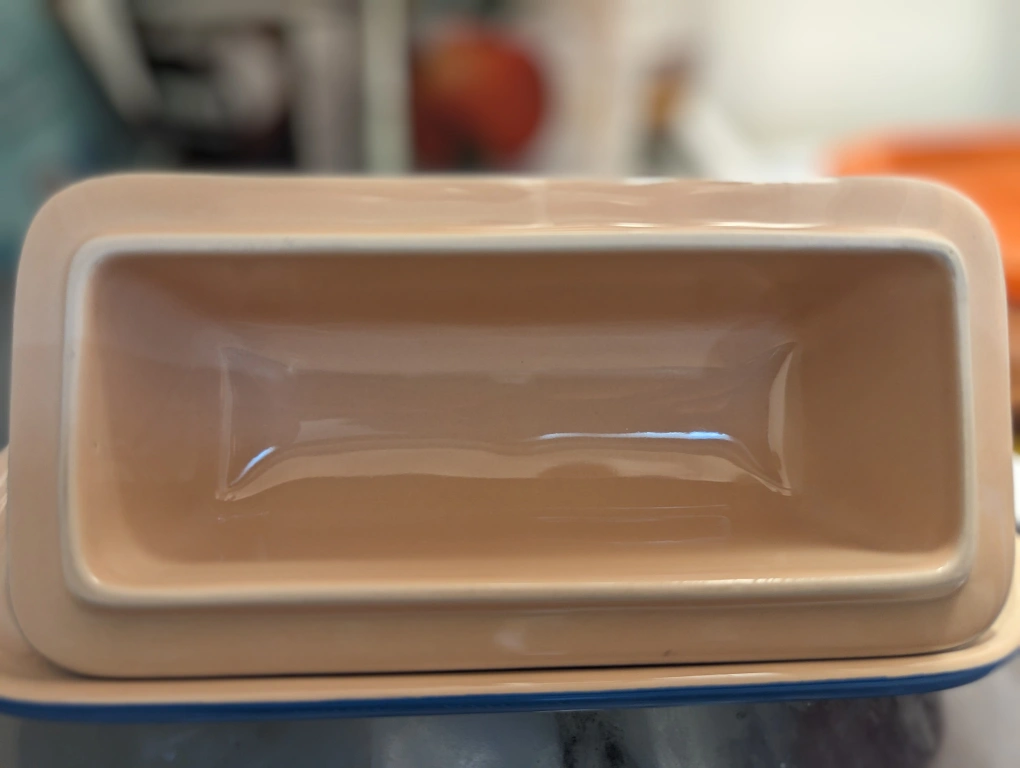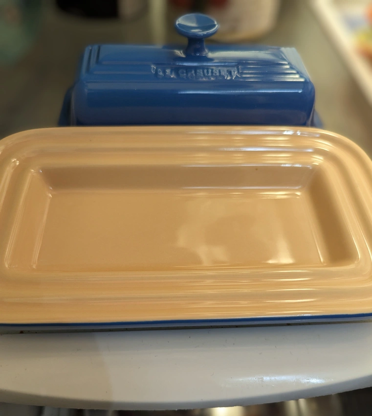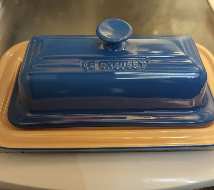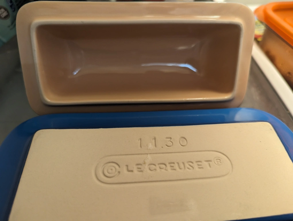 Le Creuset stoneware butter dish. Used once and then rested empty in the fridge for the next few years. No scratches or marks. Amazon link below shows similar dish selling at $118.