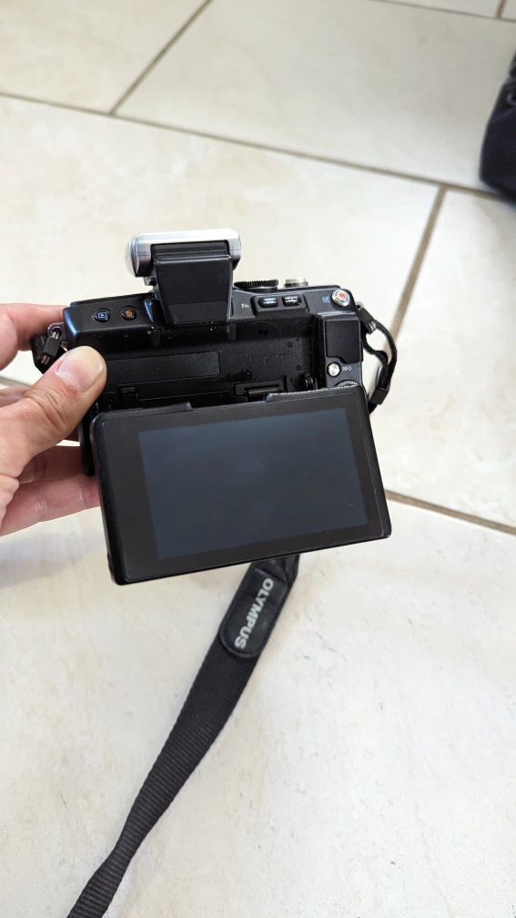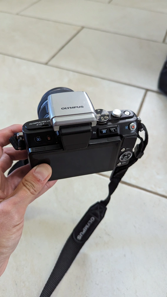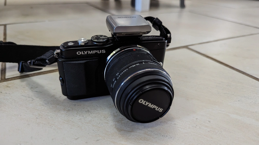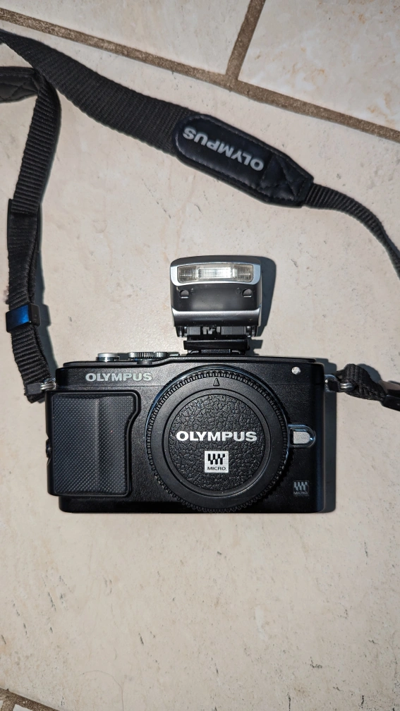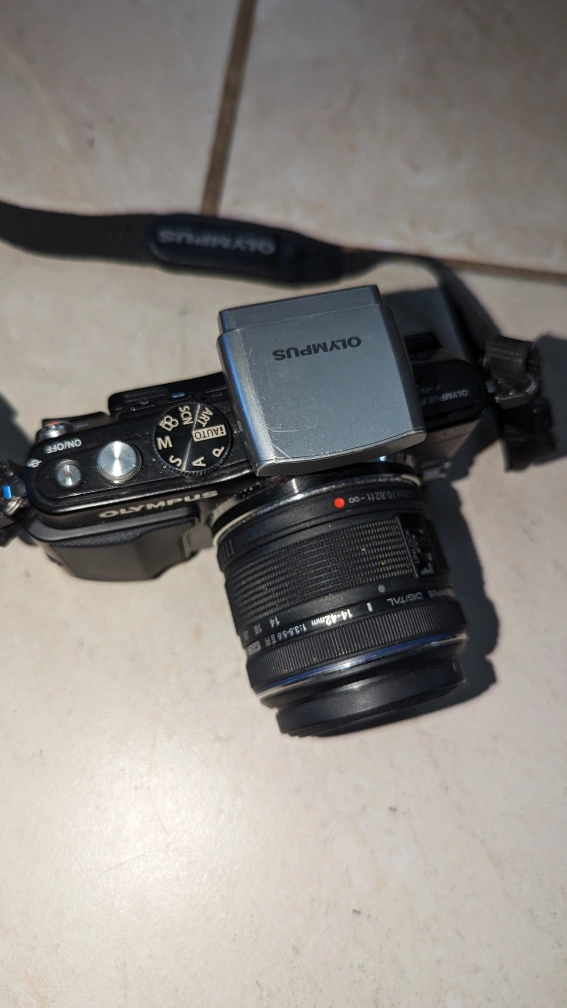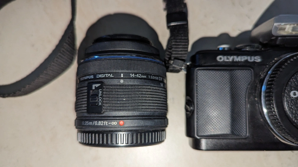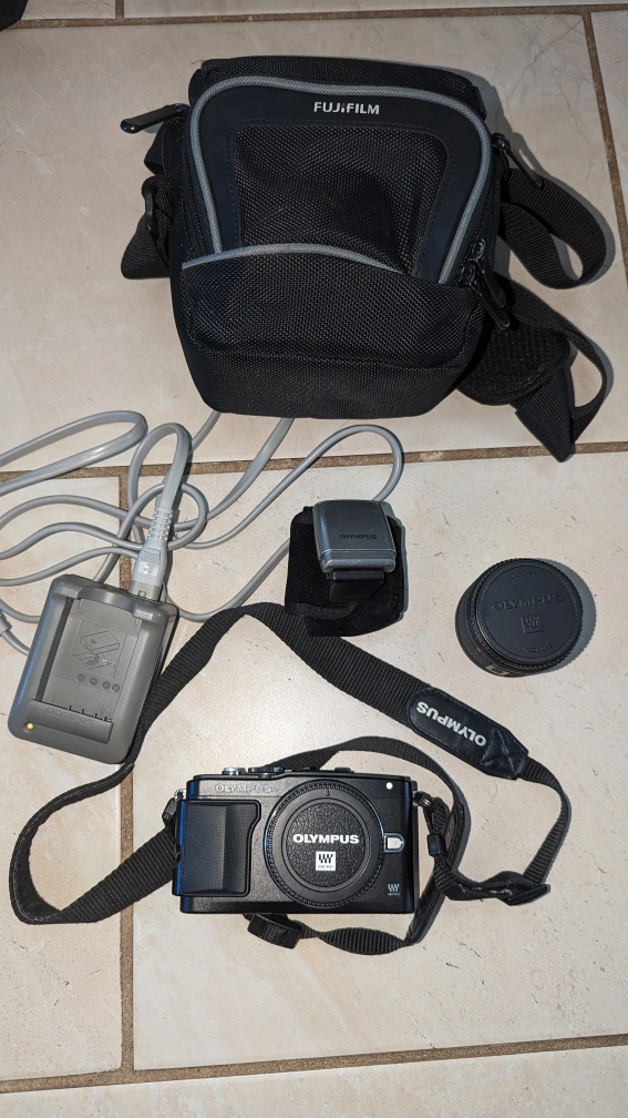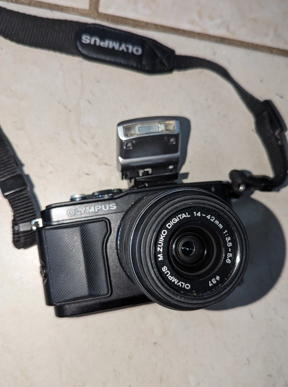 Olympus Pen Lite E-PL5 Mirrorless Camera with flash and 14-42mm lens. Comes complete with carrying case (Fujifilm brand case but fits the camera perfect). Works perfectly and takes amazing photos.