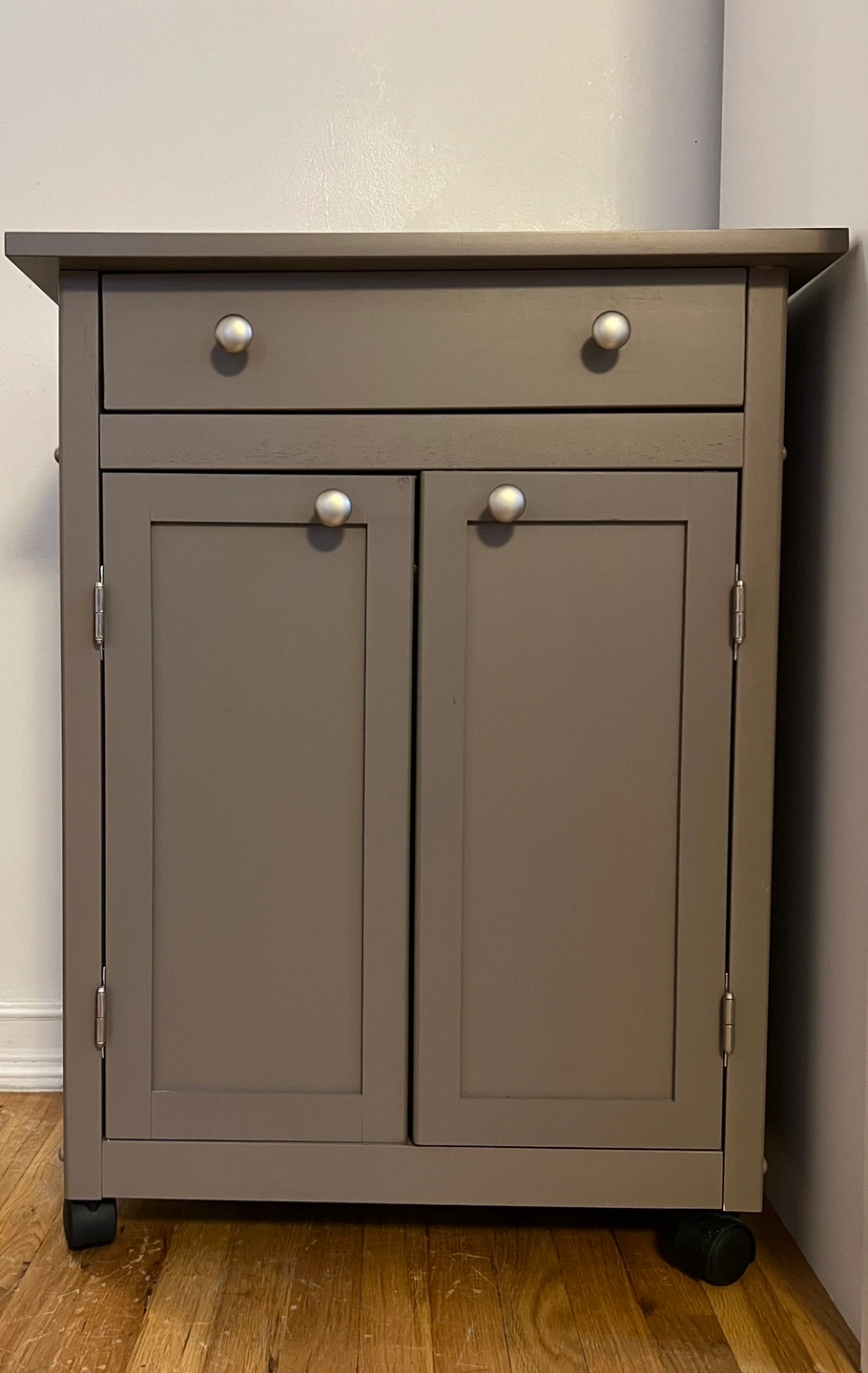 Grey kitchen cart. Drawer a little hard to open but the color is nice and it has wheels (portable). Please come pick it up (13th and A).