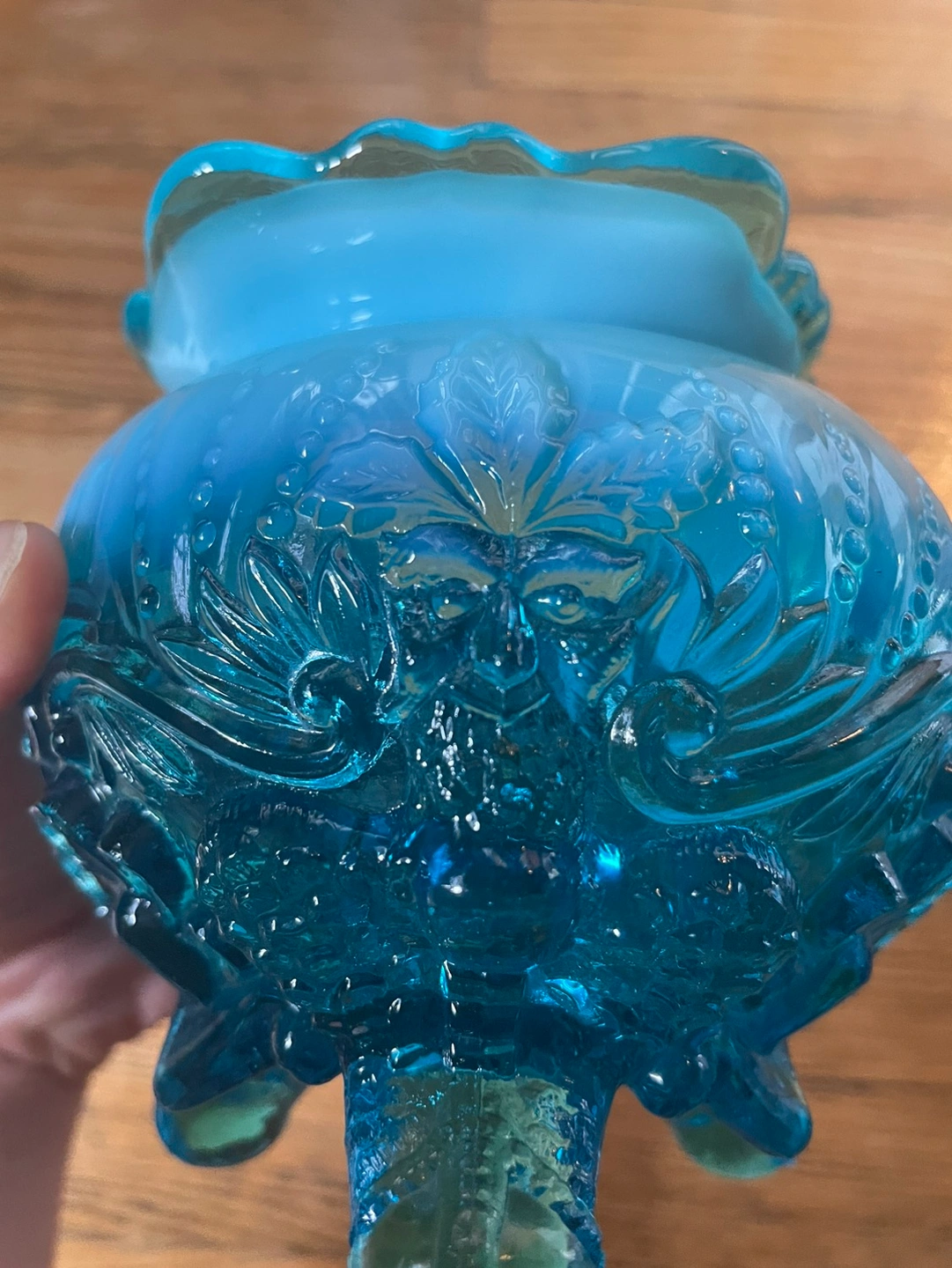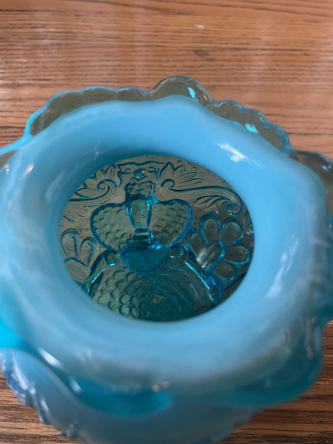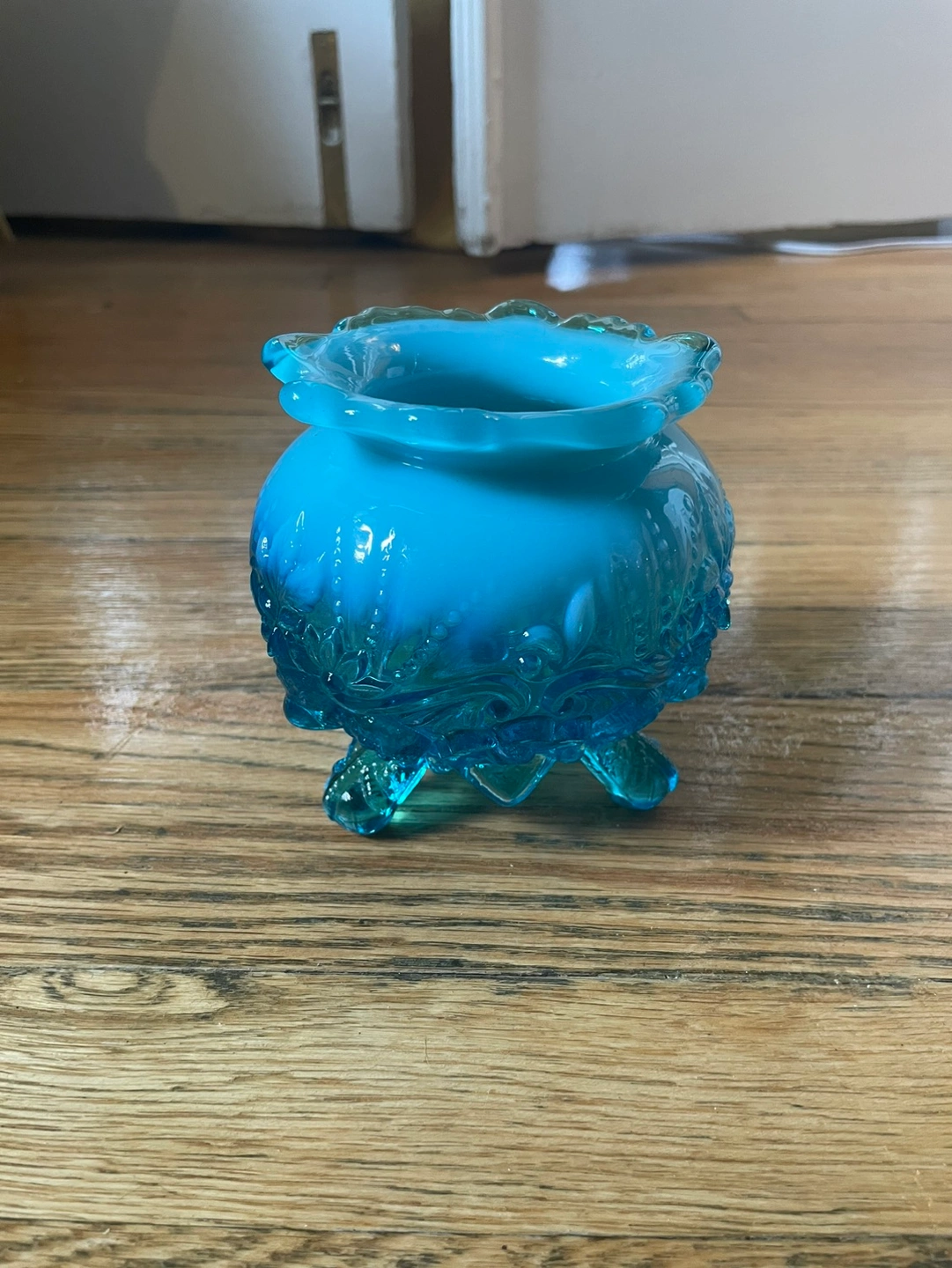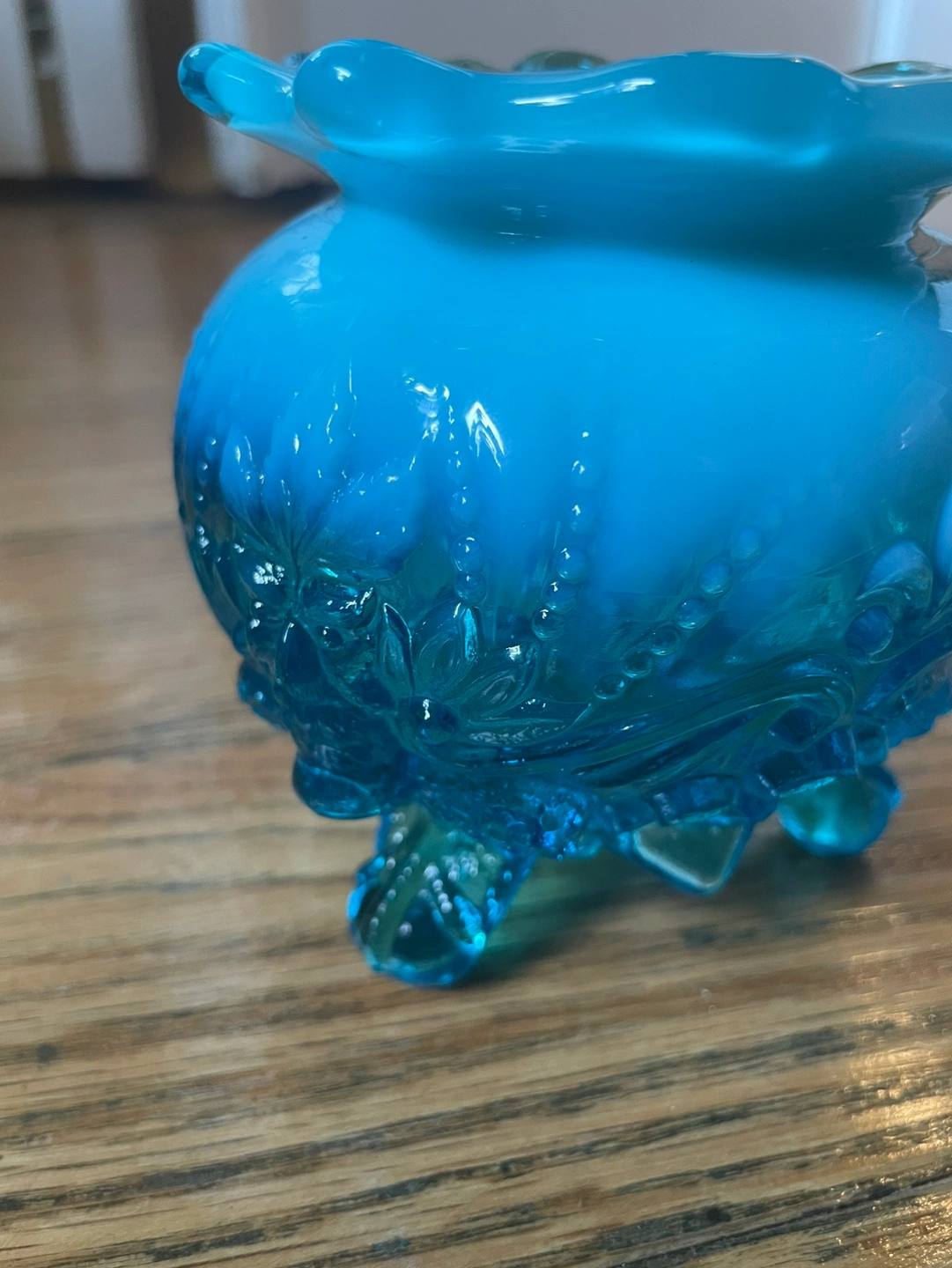 Stunning antique from the early 20th century, this blue opalescent glass bowl was originally used for potpourri/flowers. Would be perfect for plants, trinkets, candy, or anything else you can think of! Blue milky glass going into a dark clear blue, with beautiful details of birds above the feet it rests on. There are no chips or cracks and the measurements are included in photos!
