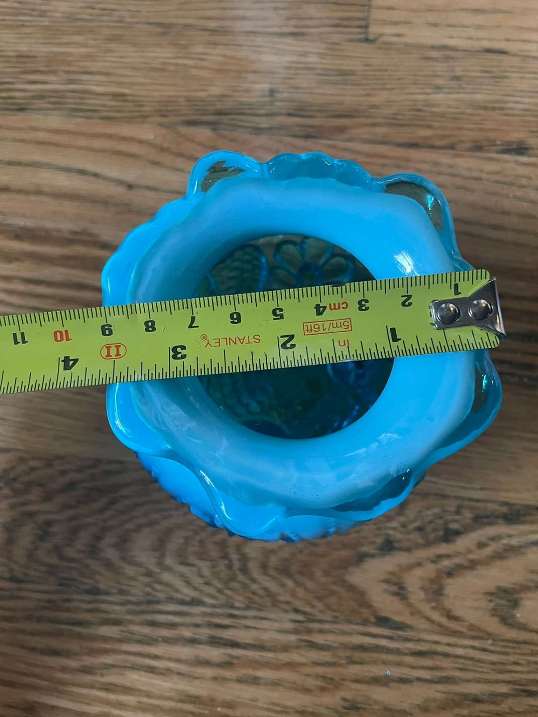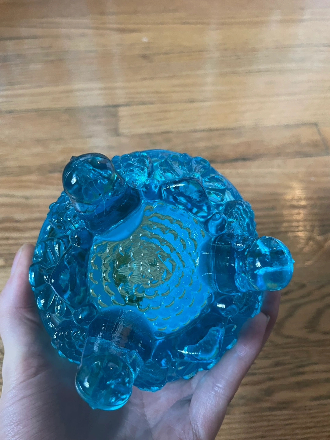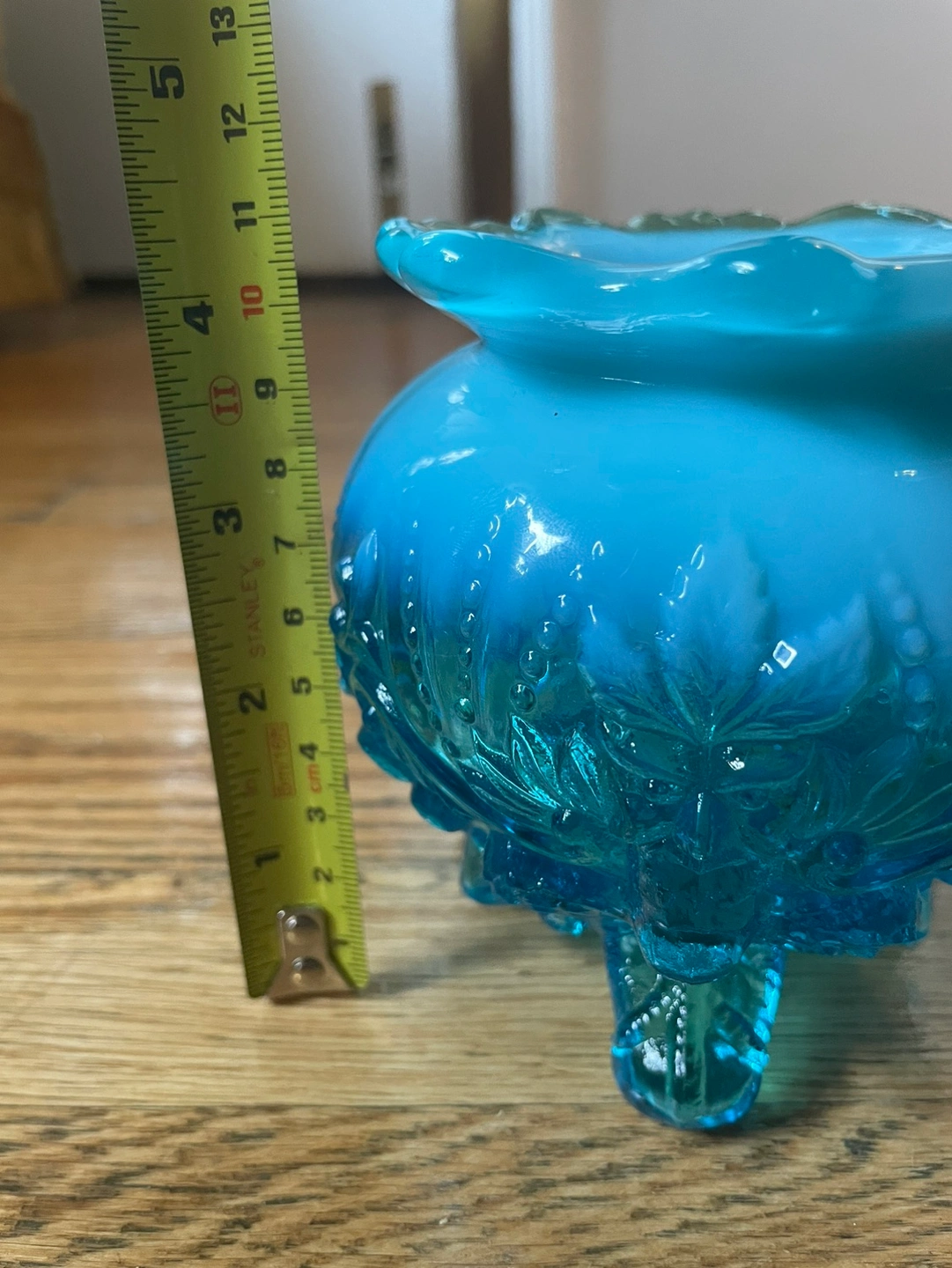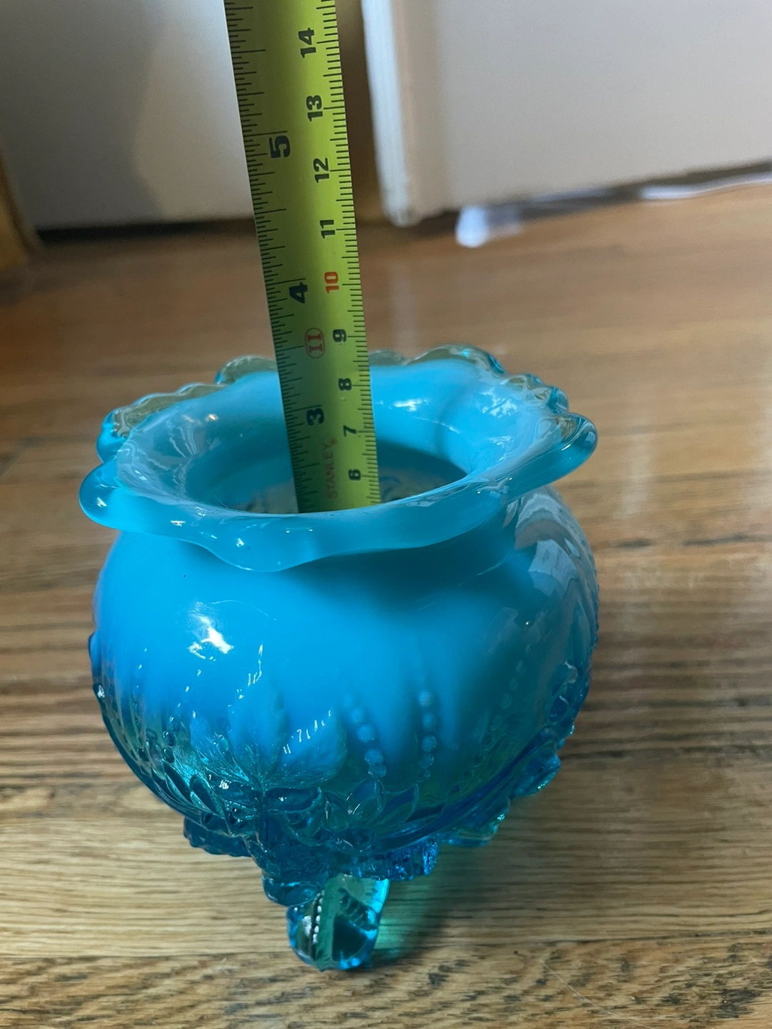 Stunning antique from the early 20th century, this blue opalescent glass bowl was originally used for potpourri/flowers. Would be perfect for plants, trinkets, candy, or anything else you can think of! Blue milky glass going into a dark clear blue, with beautiful details of birds above the feet it rests on. There are no chips or cracks and the measurements are included in photos!