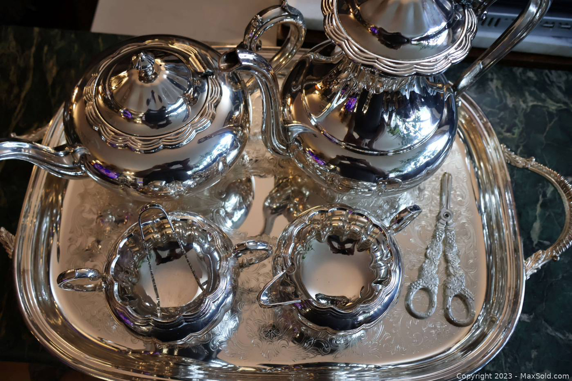 Primrose plate tea set, in very good condition. /has 7 pieces, tongs, scissors, Coffee pot, tea pot, cream and sugar and tray.