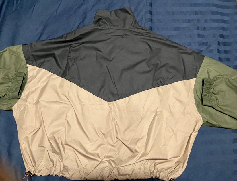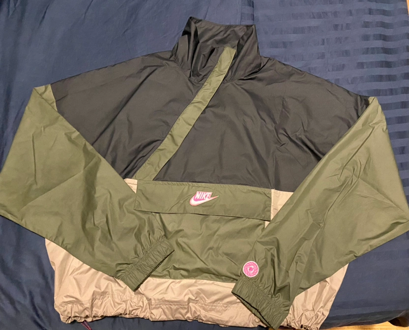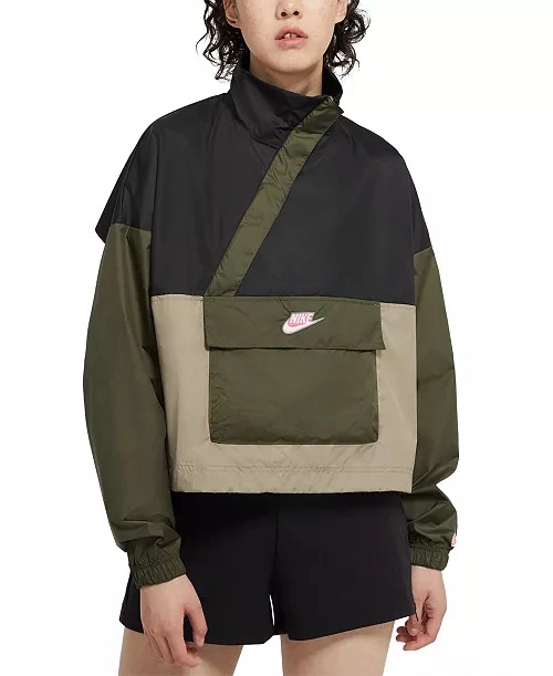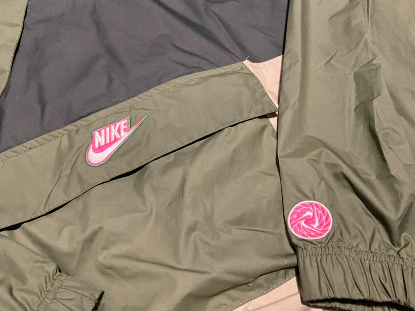 Stand collar. Offset Velcro placket and concealed half-zip closure at front. Velcro flap pocket featuring logo and Swoosh embroidered in pink and white at waist. Concealed bungee-style drawstring at hem for a tighter fit. Textile logo patch in pink at sleeve. Elasticized cuffs. Storm flap at back. Partial mesh lining. Tonal and pink hardware.