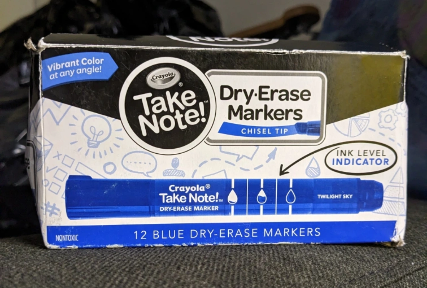 Chisel tip dry-erase Markers from Crayola. These are pretty neat, with an indicator for when they're running dry. There are 9 remaining in the box (out of 12).