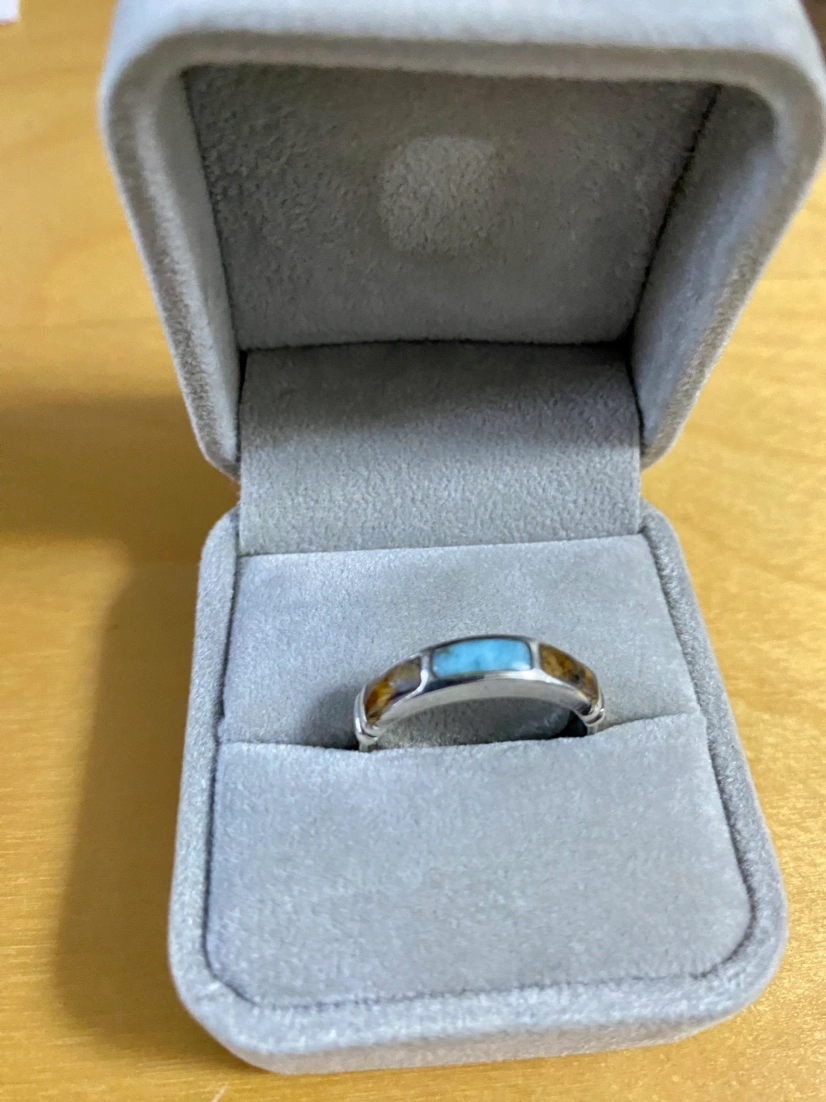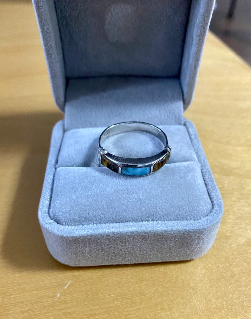 Beautiful silver ring (stamped 925) with two tiger’s eye stones & a larimar stone in the centre. Size 9