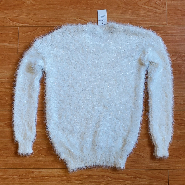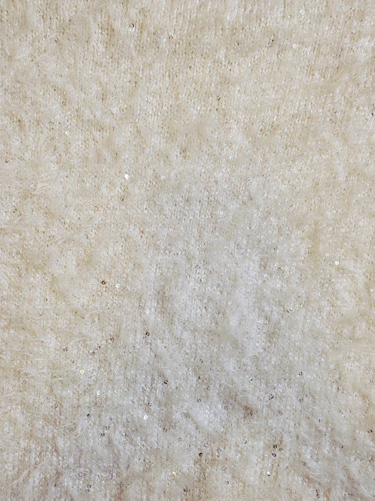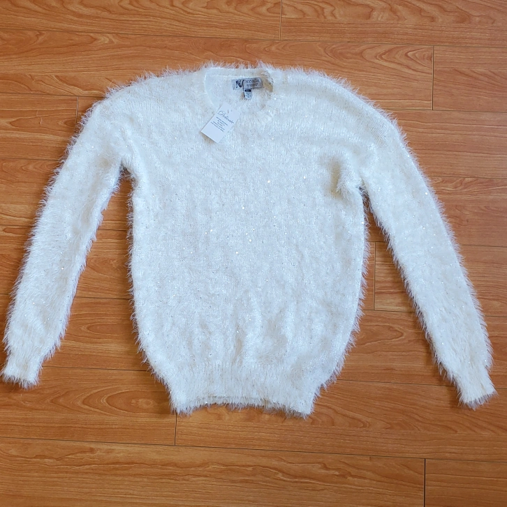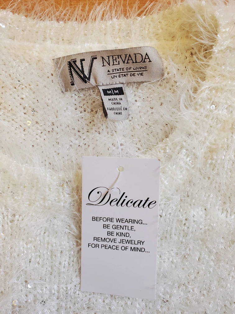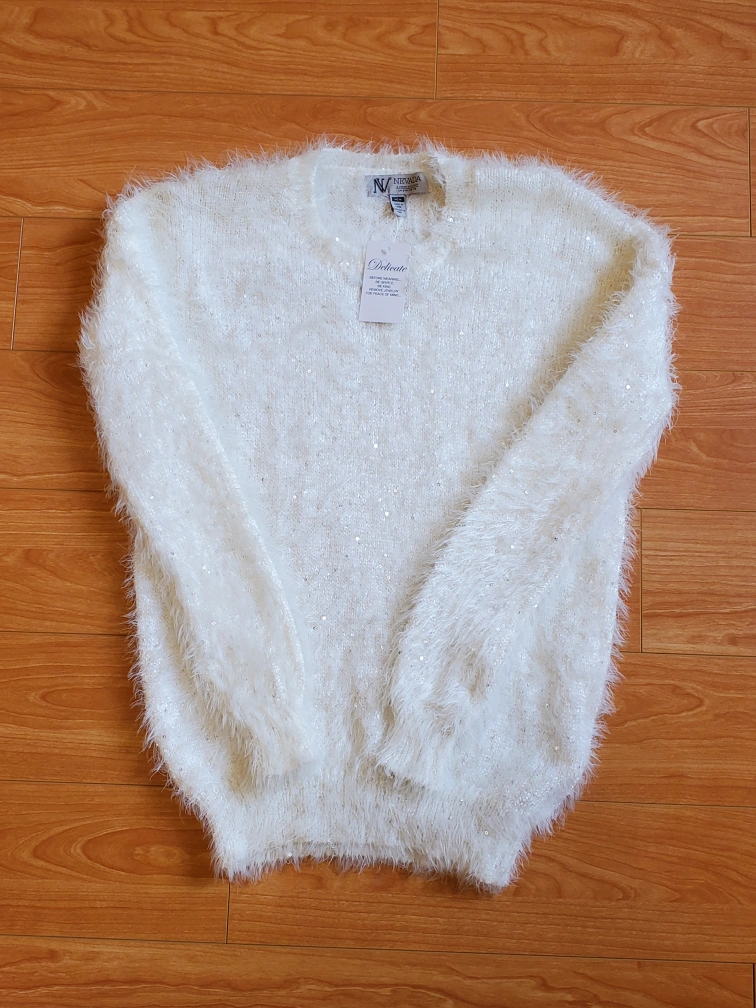 Hello, I am selling this new-with-tags white sweater. Best way to describe it would be to say that is like a faux mohair, fluffy and soft sweater, with sequins throughout for added sparkle. It is simply beautiful, but I've never had the chance to wear it. Please contact me for more information,.or to make me an offer. Thank you 😊
