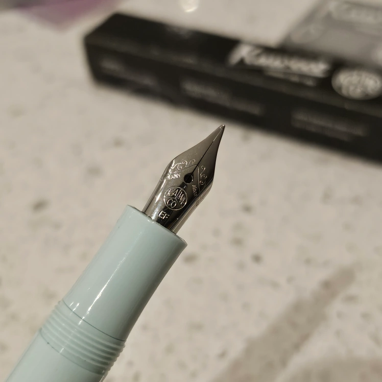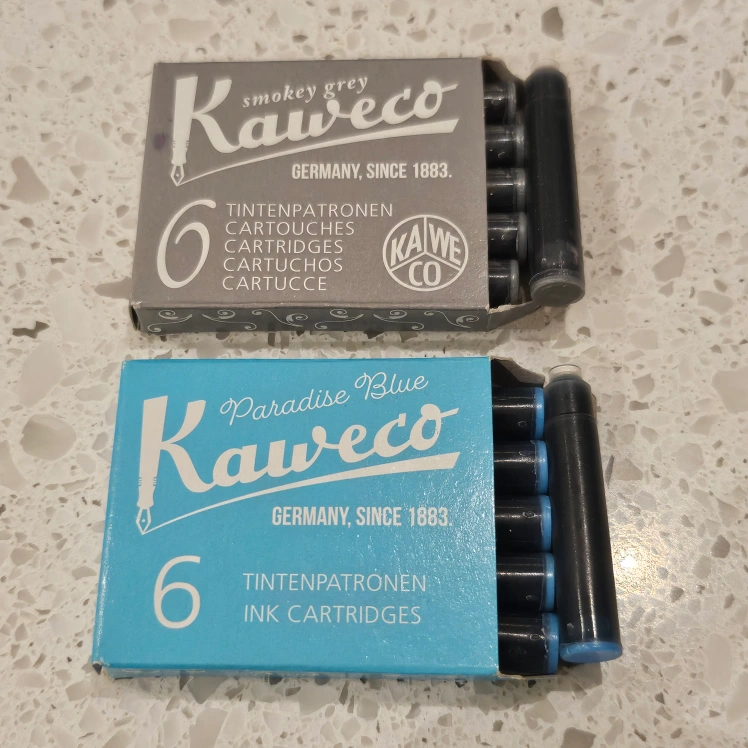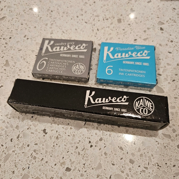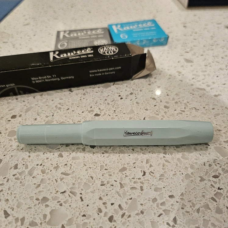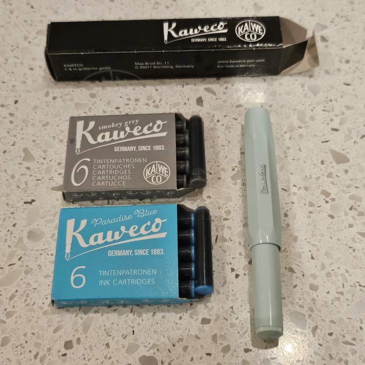 Bundle includes Kaweco Mint coloured Skyline Sport Extra Fine nib fountain pen and 2 packs of ink cartridges in Smokey Grey and Paradise Blue.
