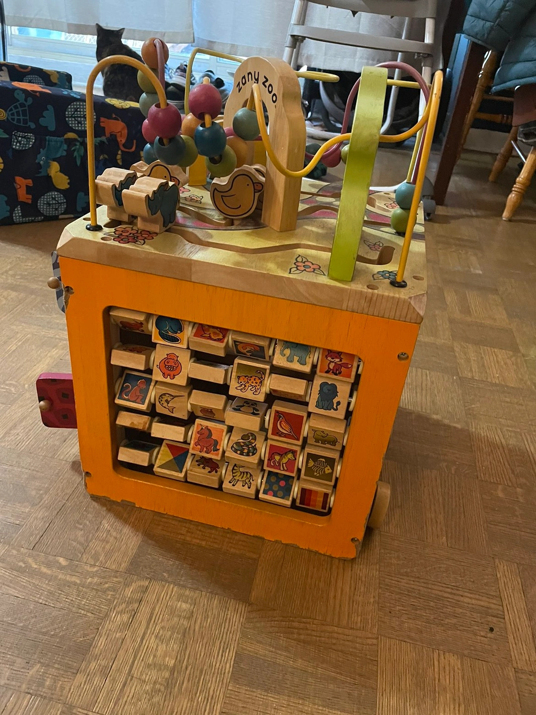 Wooden bead toy, we call it the doctor office toy lmao. Has 4 sides with different activities to do, great for when they first start standing/walking. Was around $100 new!