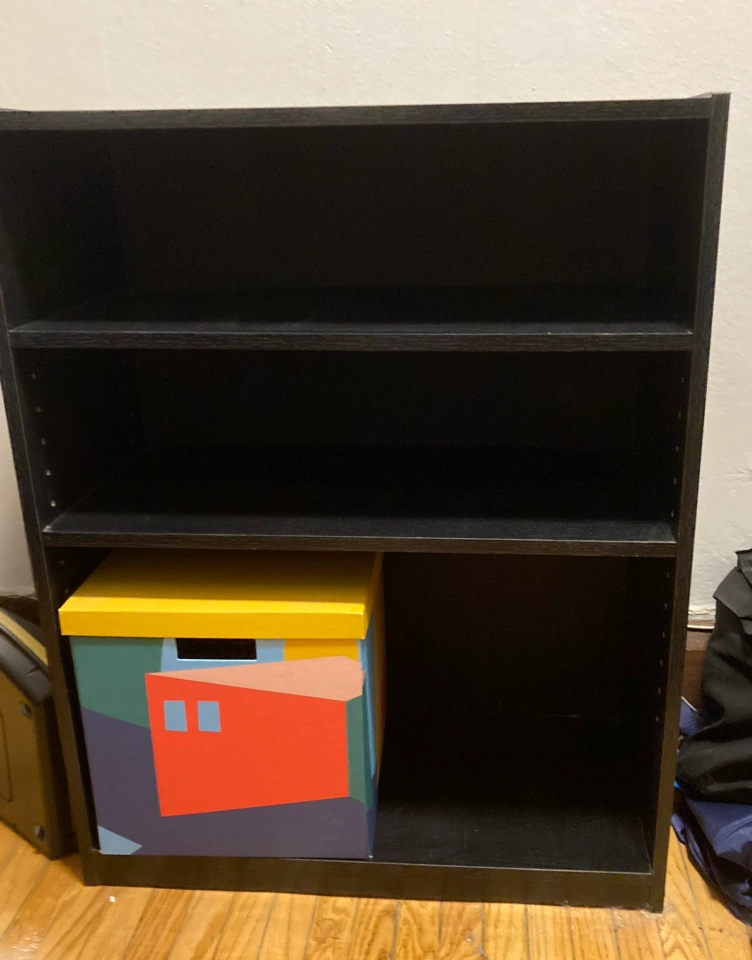Black 3 tier bookshelf. This is a normal rectangular shelf I just don’t have room to photograph it properly. Can include IKEA storage box that’s pictured if you’d like. Pick up only near St Clair West and Bathurst, e-transfer or cash accepted