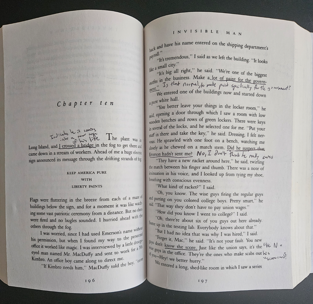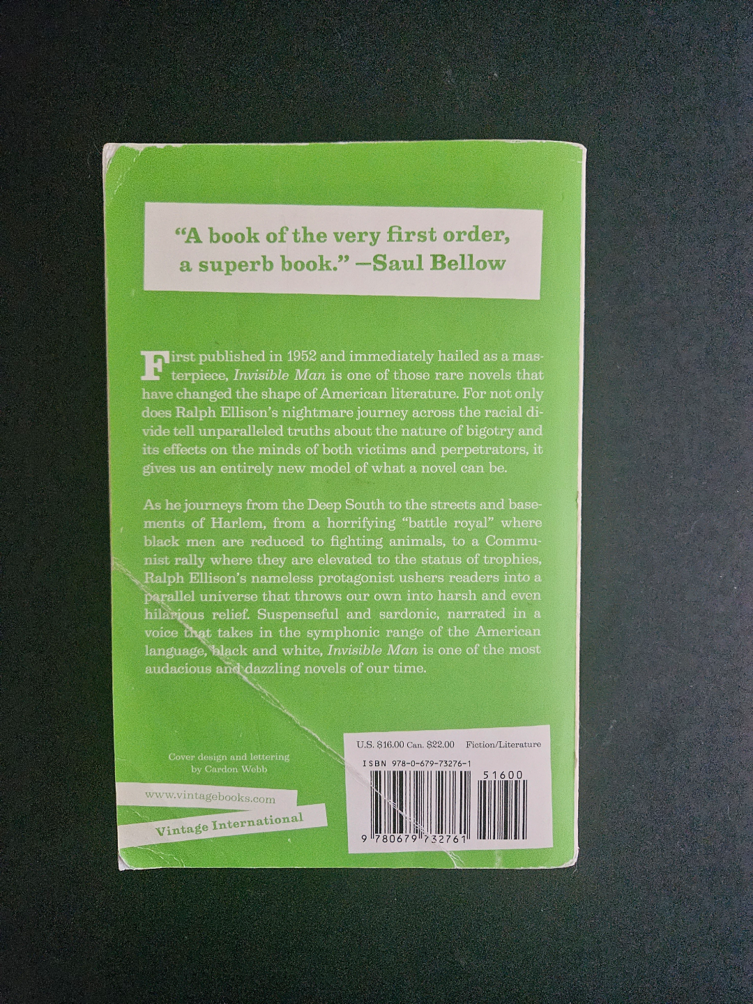 323Paperback edition of Invisible Man by Ralph Ellison. The book is annotated, but other than that in good condition. #freecycle