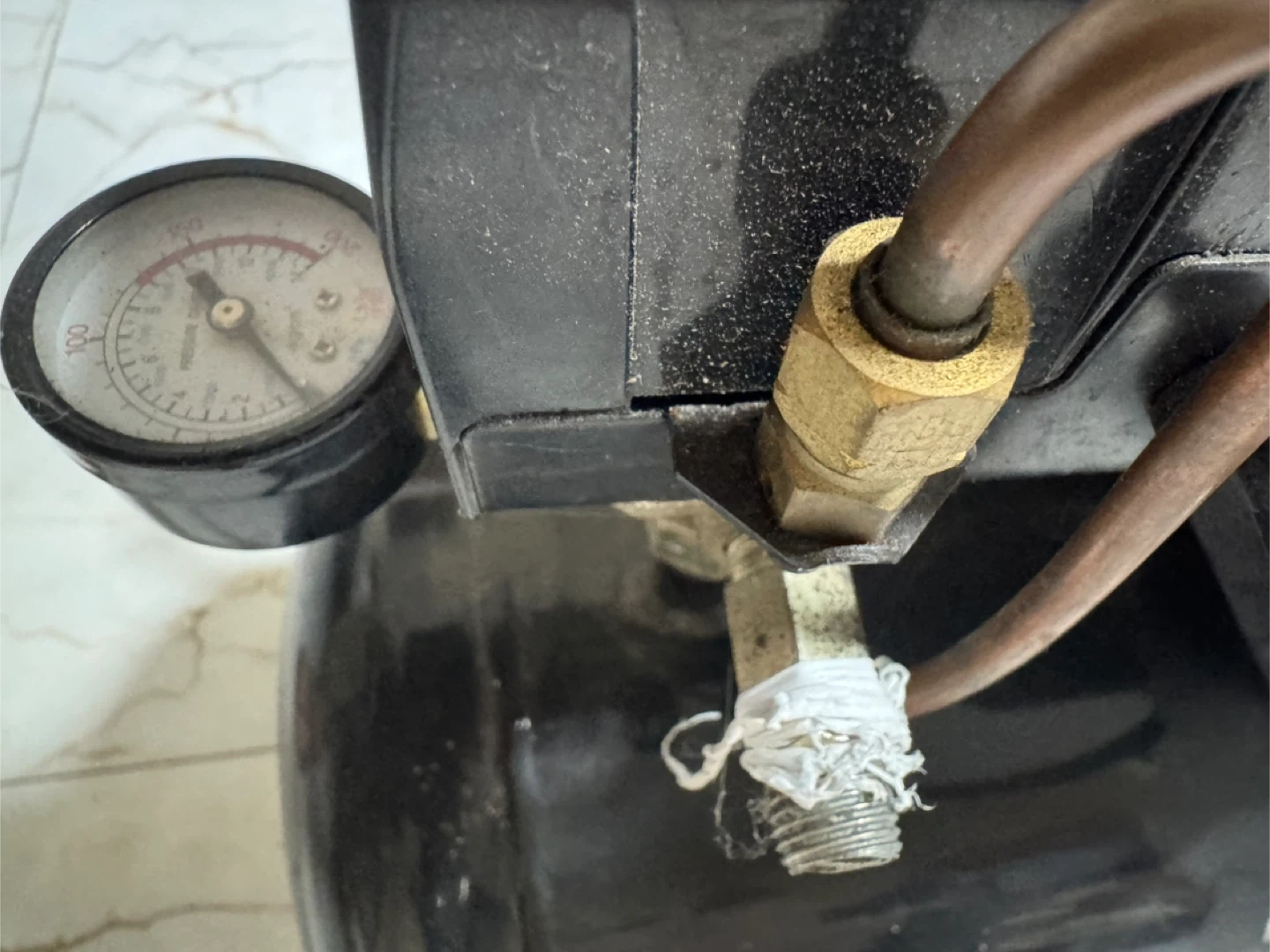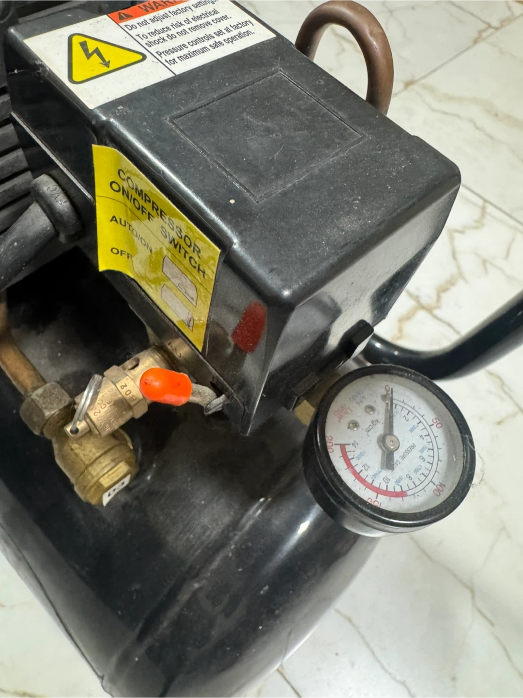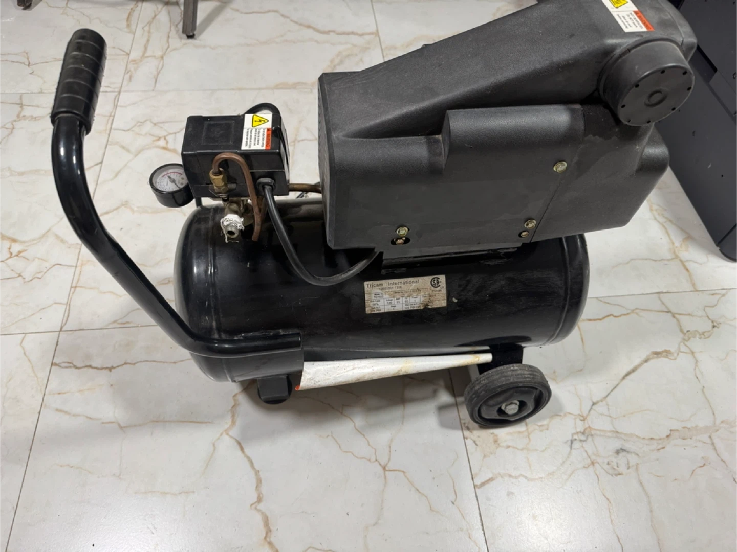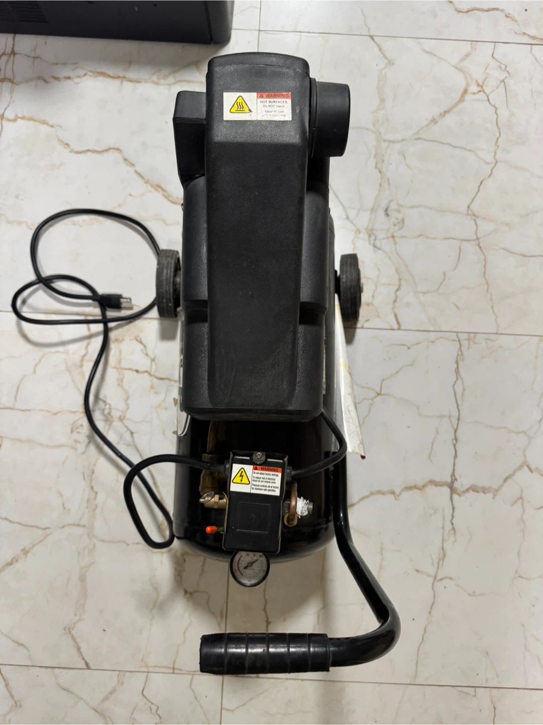 Portable air compressor with a black tank. Features a built-in pressure gauge and handle for easy transport. Includes power cord.
