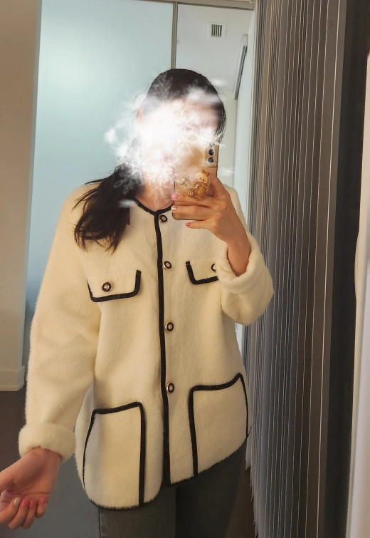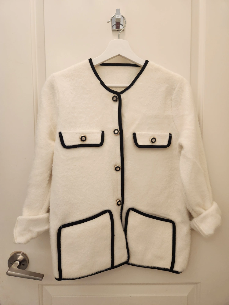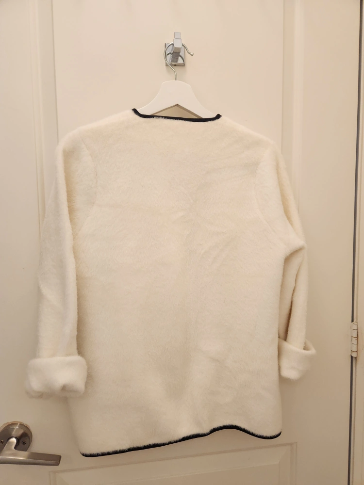 New item. White colour cardigan, jacket(outer) vibe. All the buttons in the front can be opened. very soft material. perfect material to wear from now to winter. I'm selling it because I have too many similar styles. It's easy to style with jeans or black slacks. Purchased last winter in Korea. Came in one size. I usually wear a size S in Canada.