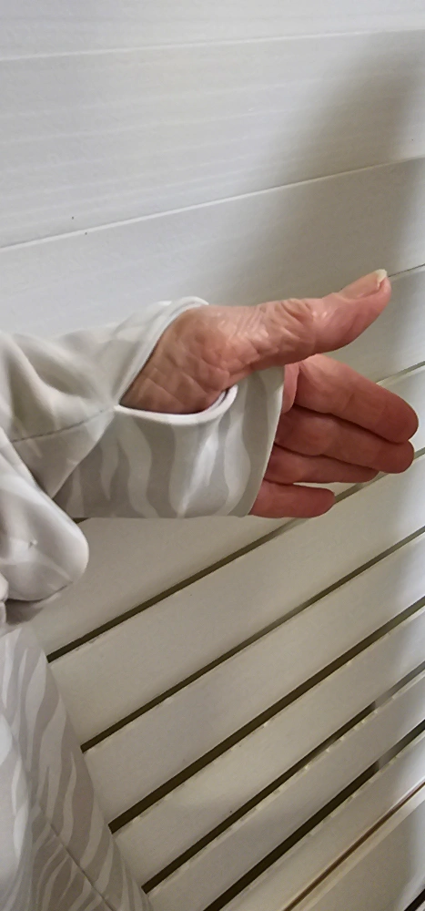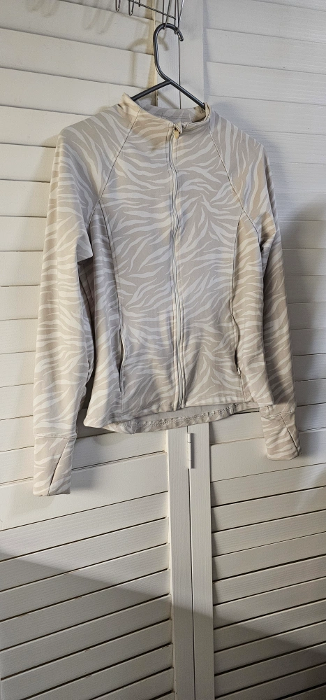 Long-sleeve running jacket. Zipper closure. Two pockets. White zebra pattern on a light brown background. the zippers on the right pocket is broken