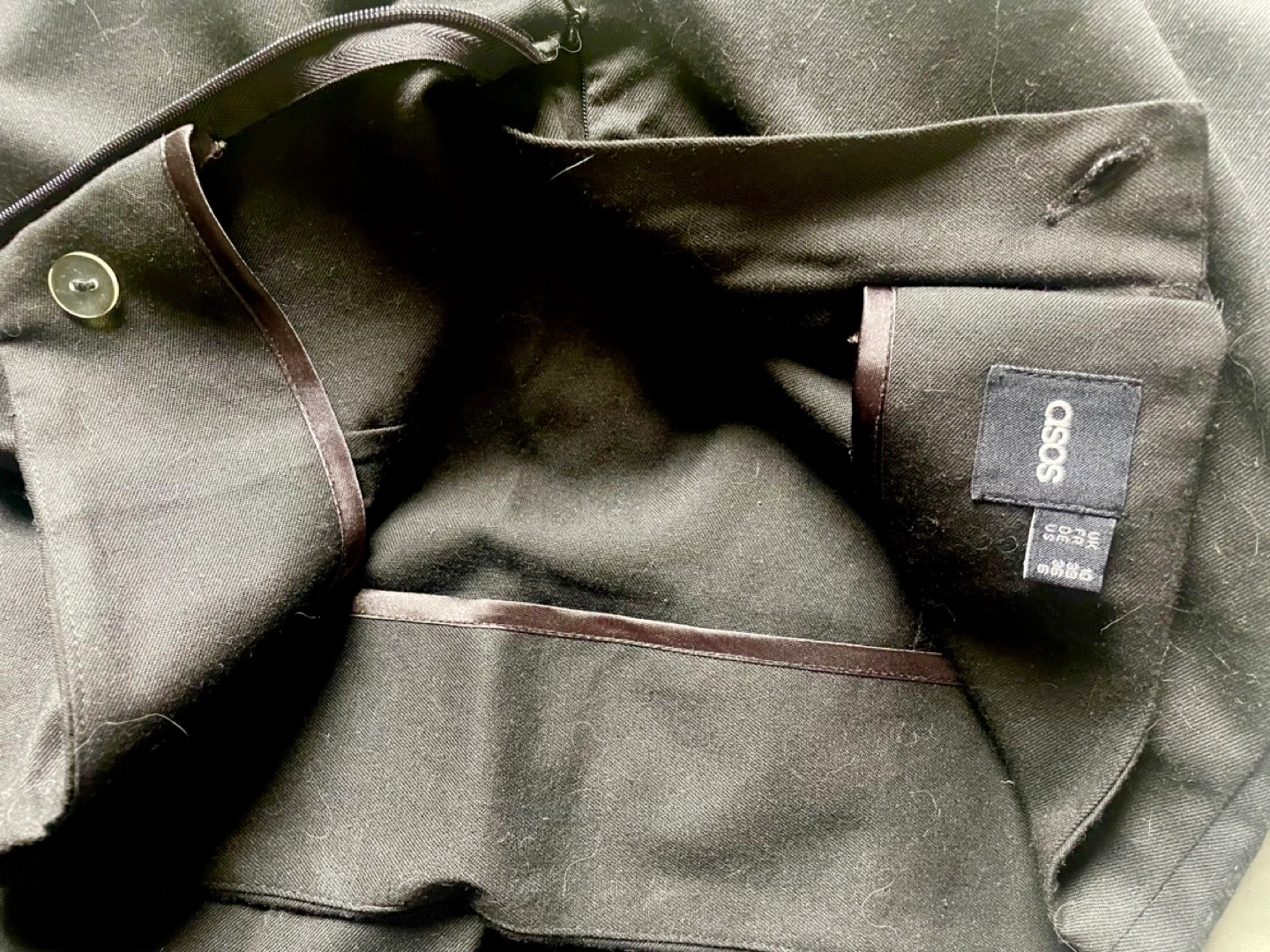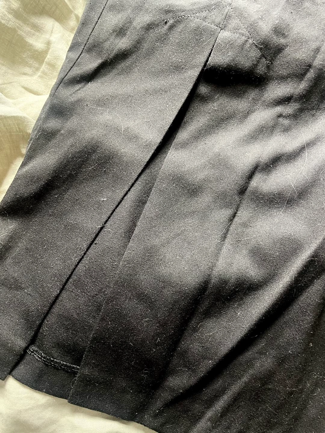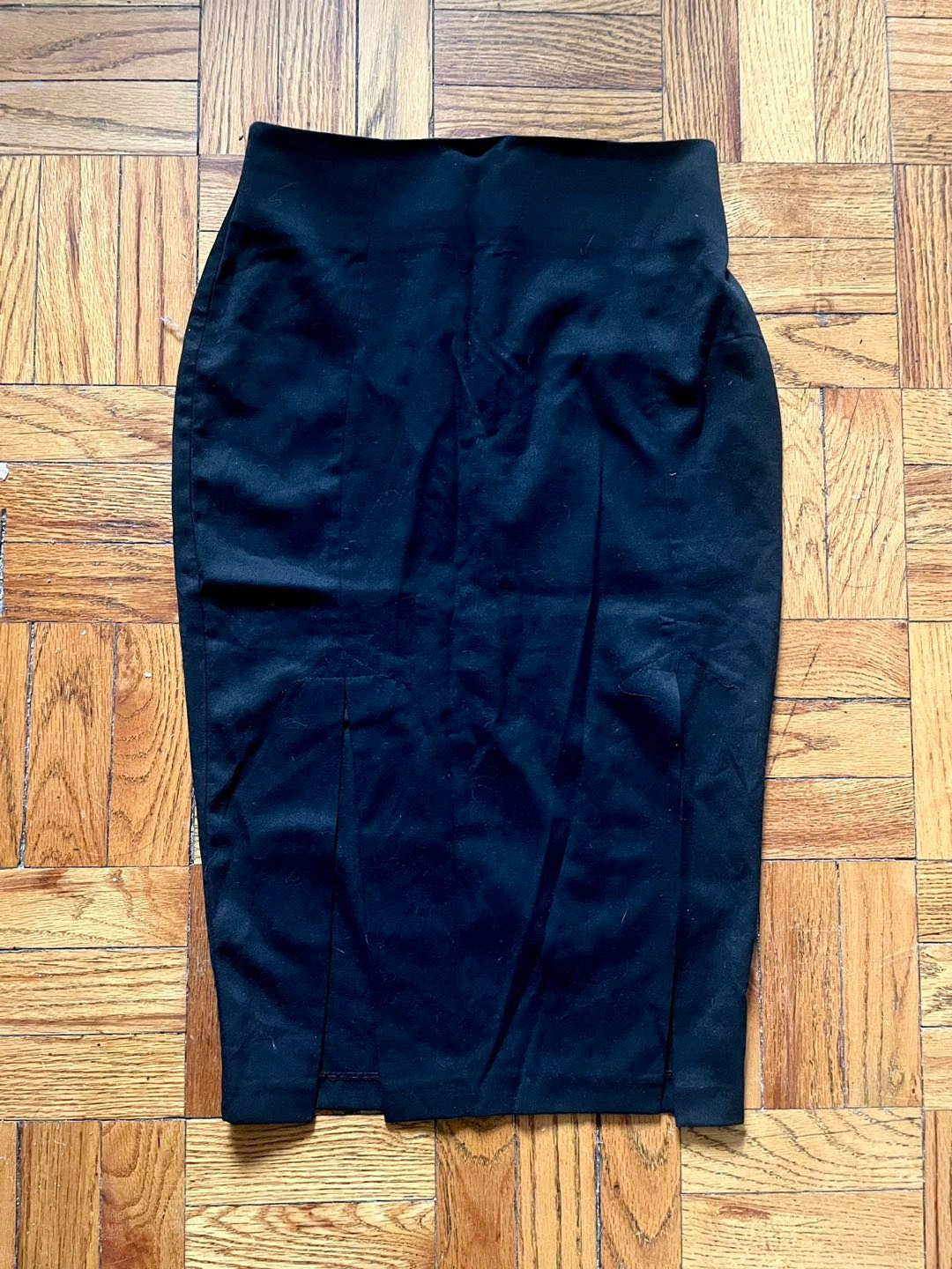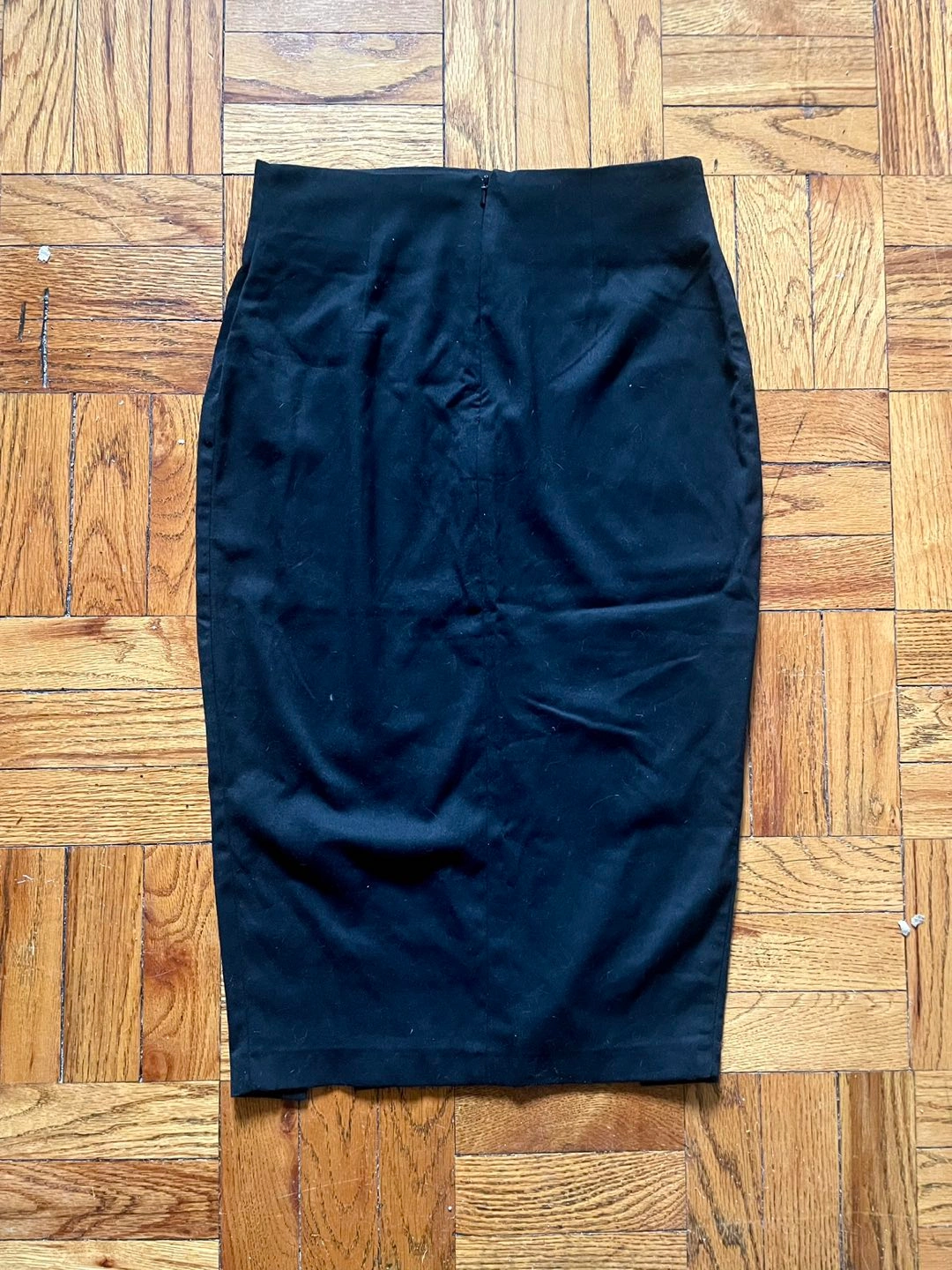 ASOS high waisted black pencil skirt with two front slits that comes up to mid thigh depends how high waist you wear this, bit of stretch for a great fit. Nice soft fabric. Invisible zip up the back. The skirt falls just below the knee for me (5โ6). Great for cocktail hour.