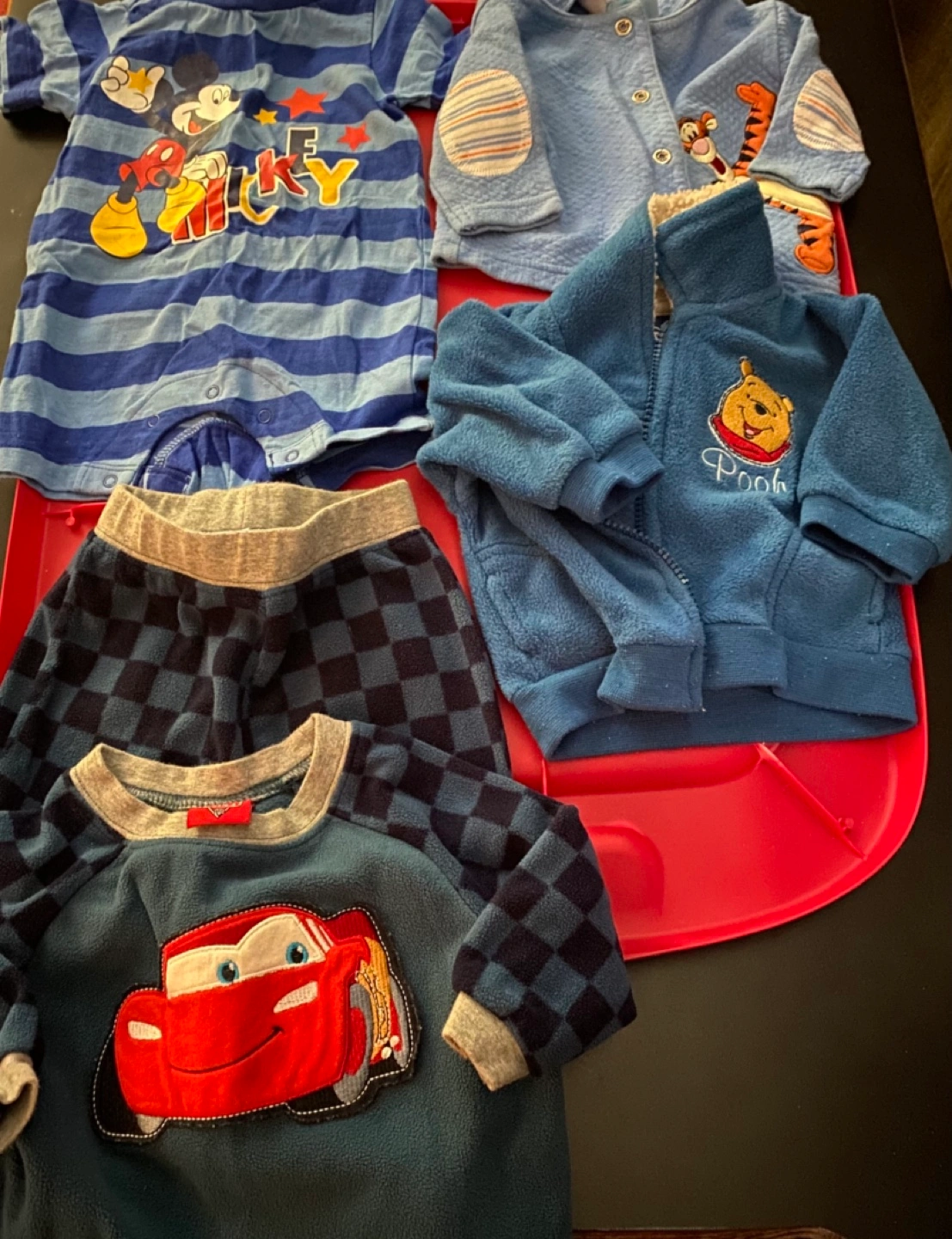 Bundle of baby boy clothes. Includes a Mickey Mouse short-sleeved onesie, a Winnie the Pooh fleece jacket, a Cars fleece top, and checkered pants. Great for layering.