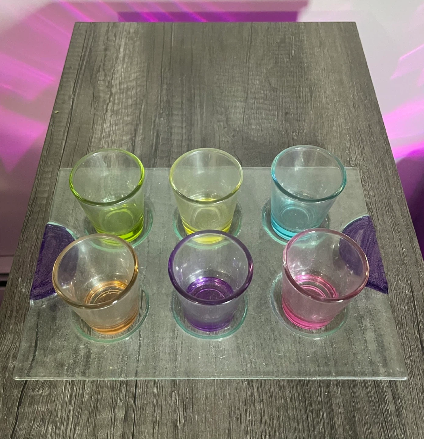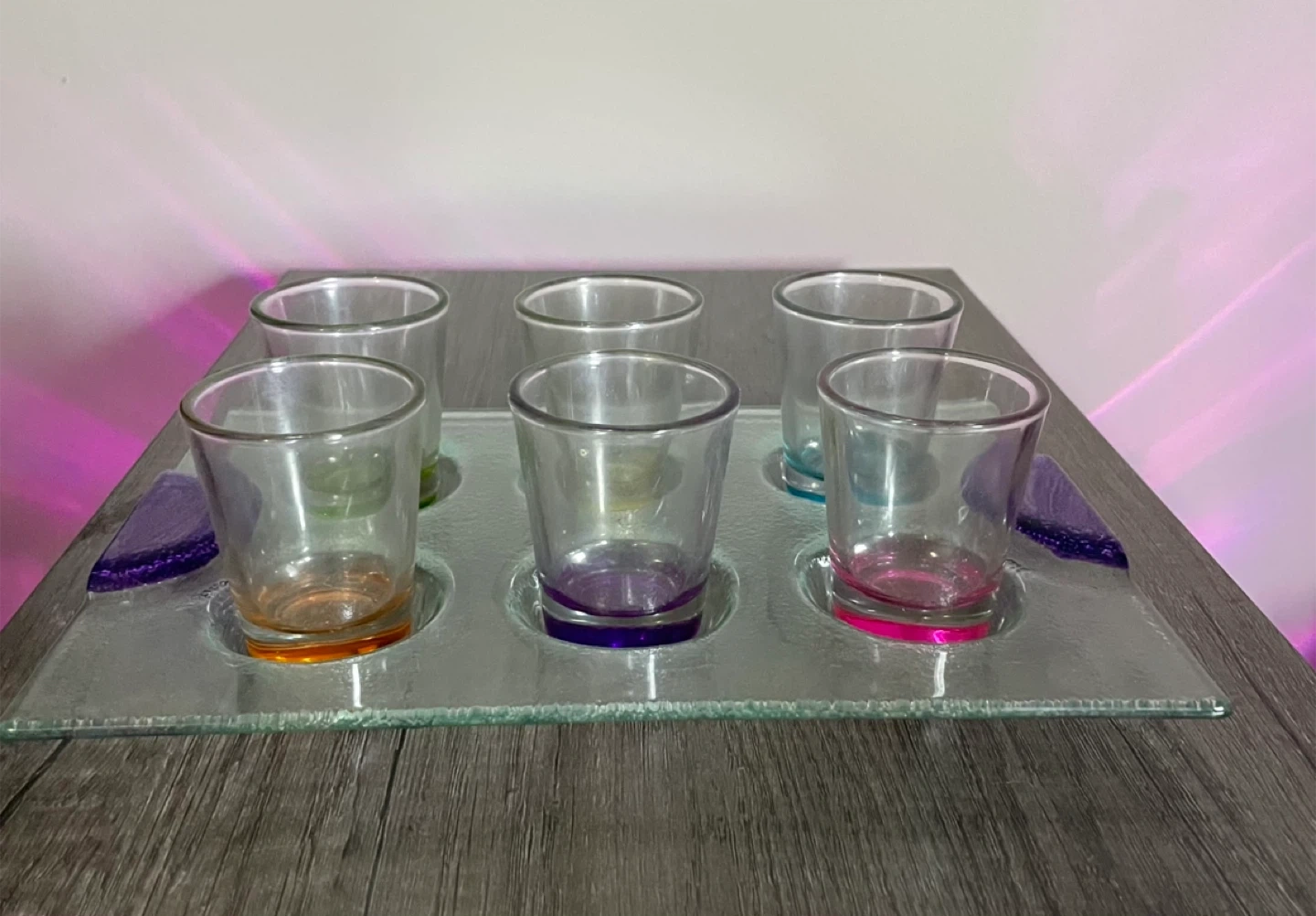 Unused six piece colourful shot glass set with serving tray.