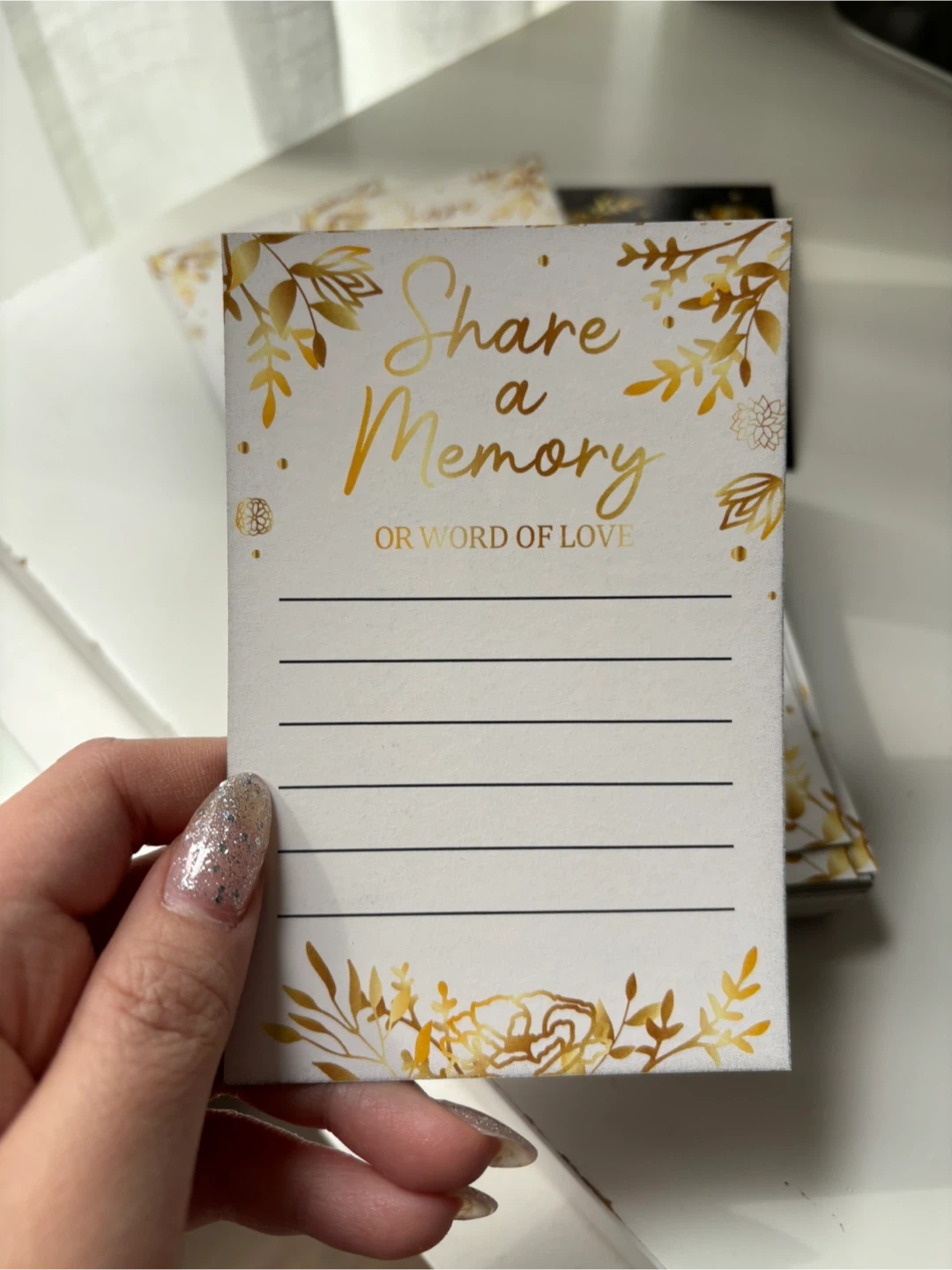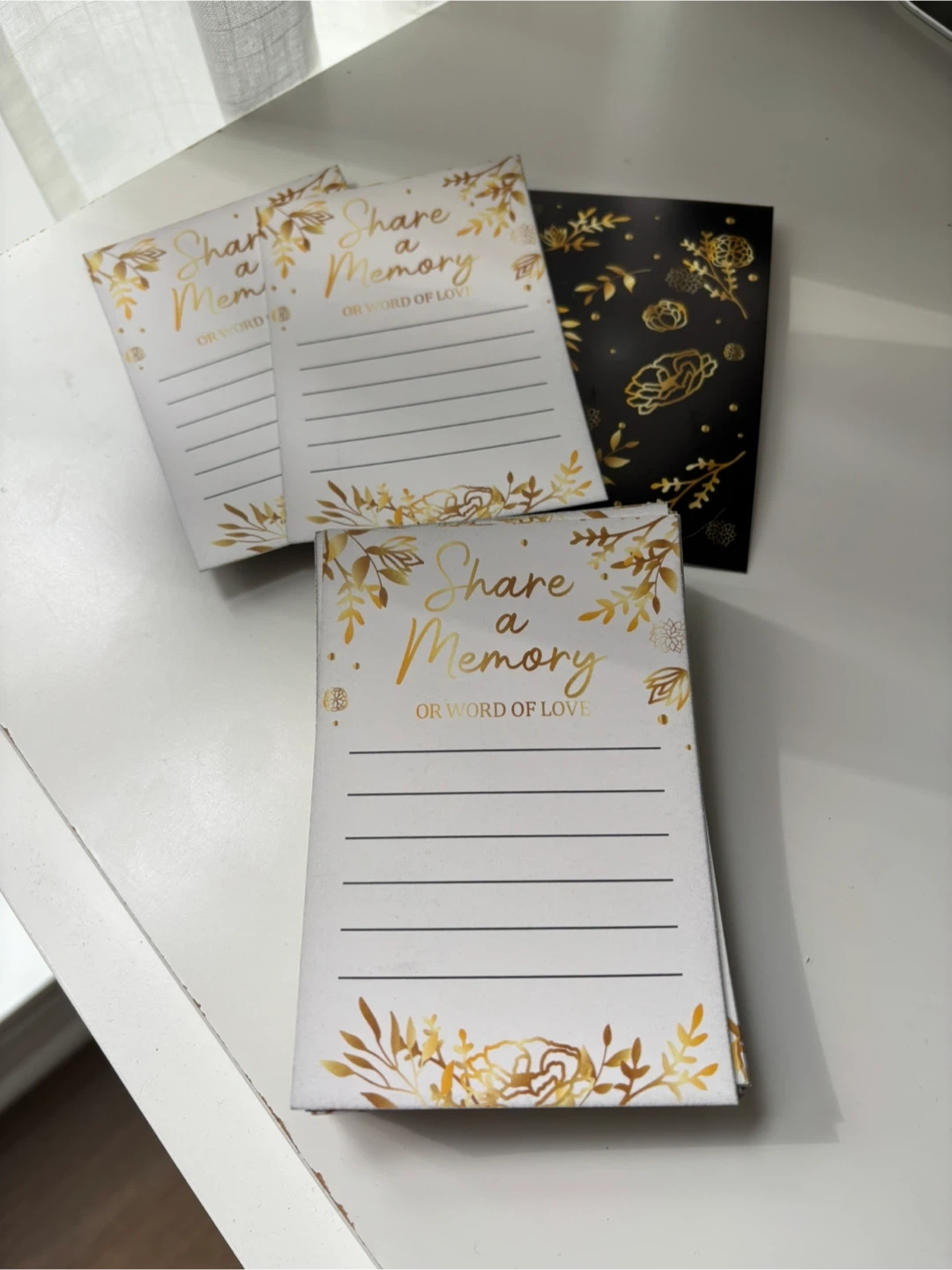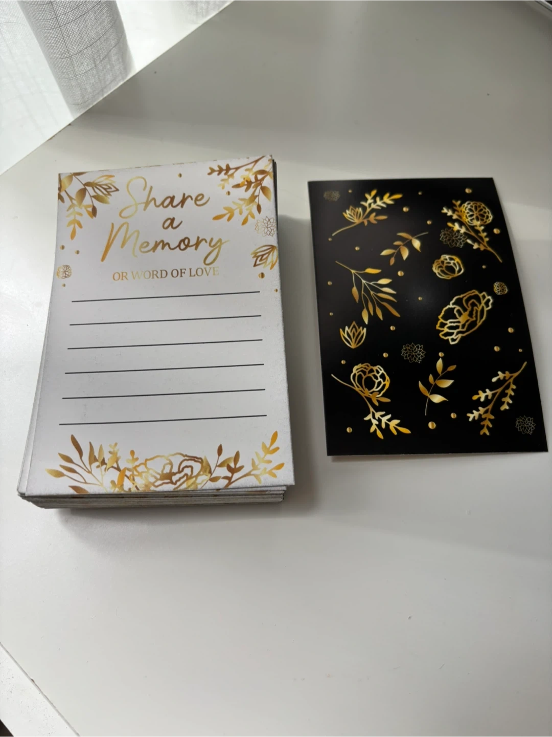 Pack of cards for guests to share a memory or word of love. Features a white card with gold floral design and lined space for writing. Includes a black card with a gold floral design. Perfect for birthdays, bachelorettes, bridal showers, weddings or special events!