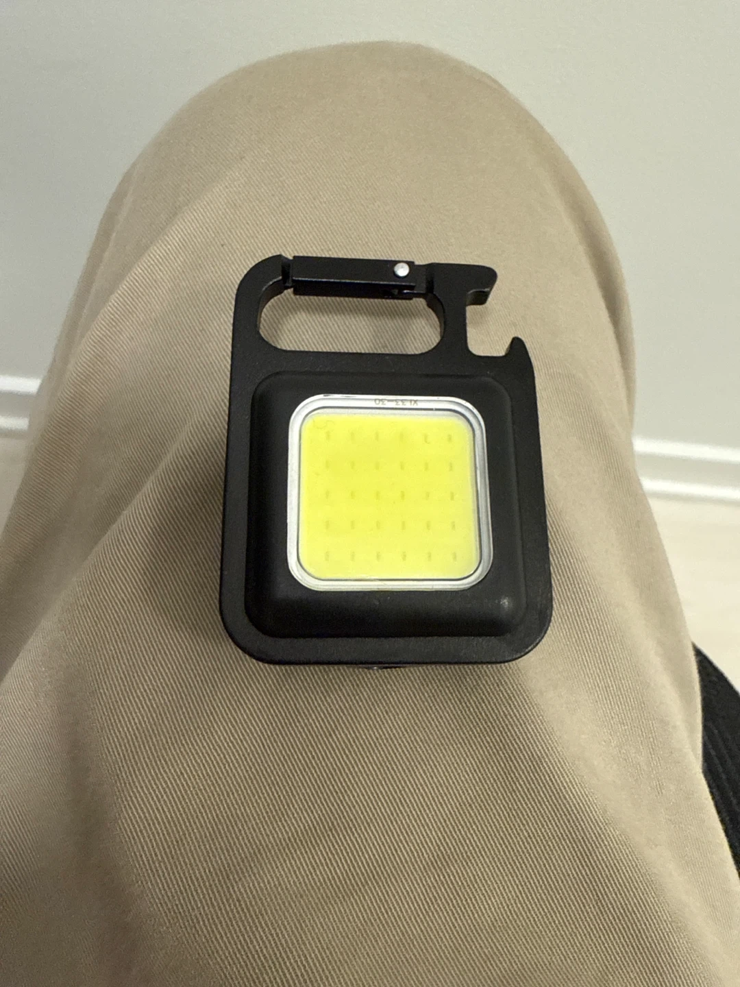 This is a compact COB LED flashlight with a carabiner clip. It's black and features a bright light for quick tasks. Great for keeping on your keychain or bag! Rechargeable and great for camping trips.