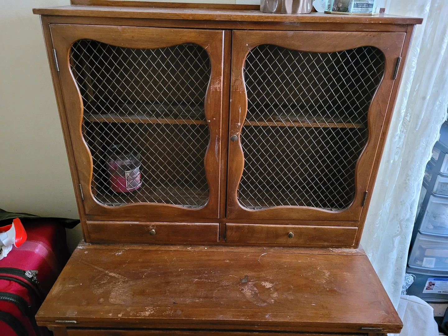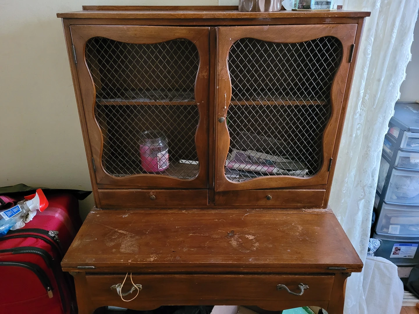 I used this as a vanity, the desk folds out for more room, the wood is scratched. I intended to use it as a project and paint it but I'm moving and don't have the space to keep it