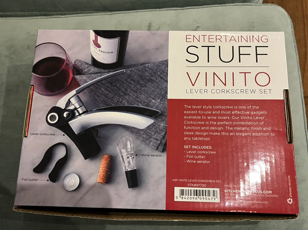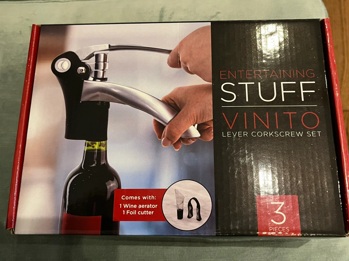 "This lever style corkscrew is the easiest-to-use gadget for opening a bottle of wine. Open any bottle in just a few seconds with a simple up-and-down motion. This set includes a handy foil cutter and aerating spout. The perfect addition to your home bar and a great gift for your favourite host.