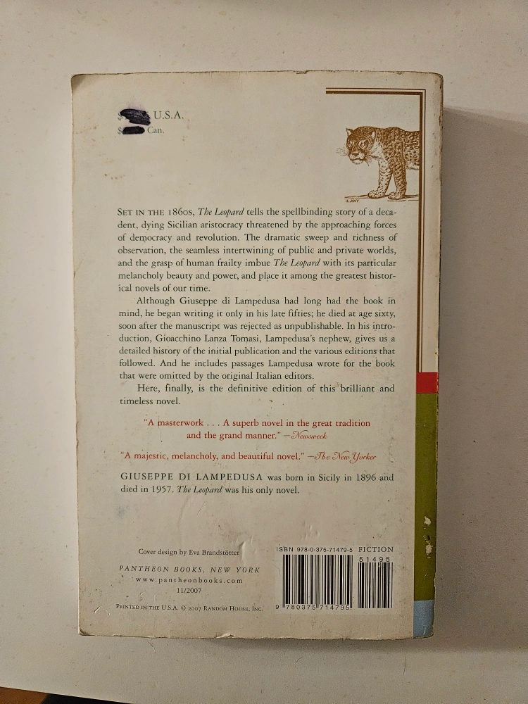 323Good condition paperback novel, The Leopard by Giuseppe di Lampedusa.