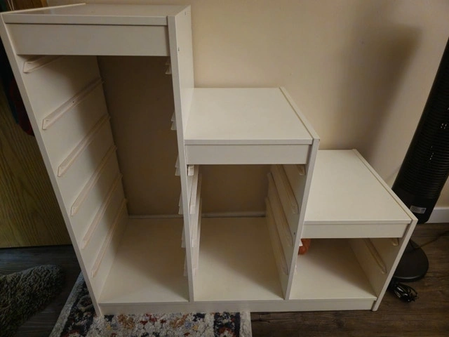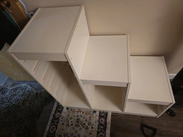 This used storage shelf is a versatile piece, perfect for organizing any room. It features a unique, stepped design with multiple shelves, offering ample space for books, decor, or storage bins. The clean, neutral colour ensures it will blend seamlessly with any decor. It is in good condition. Add a touch of whimsy to your organization! If the ad is up, the shelf is available, ready to bring order and charm to your space. Need gone ASAP.
