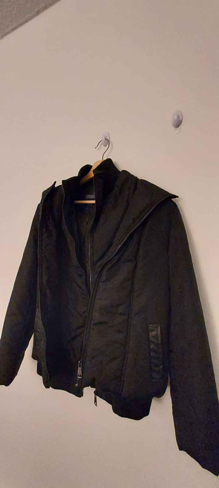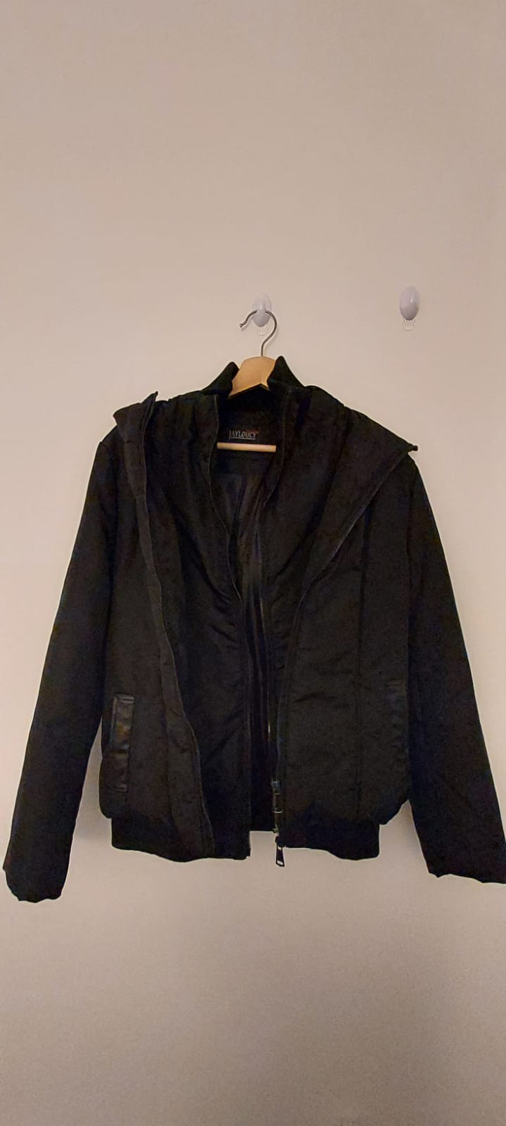 A black jacket with double zipper and double lining. Jacket has a hood as well and faux leather detailing on the pockets. The sleeves have cuffs that tightens around the wrist. Mid to heavy weight jacket with protection in temperatures from -10 to 5 degrees. Layer up or layer down for added warmth. Perfect for Toronto winters