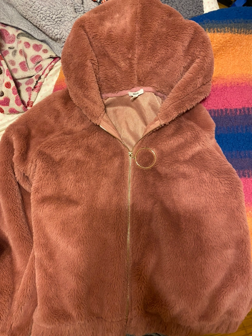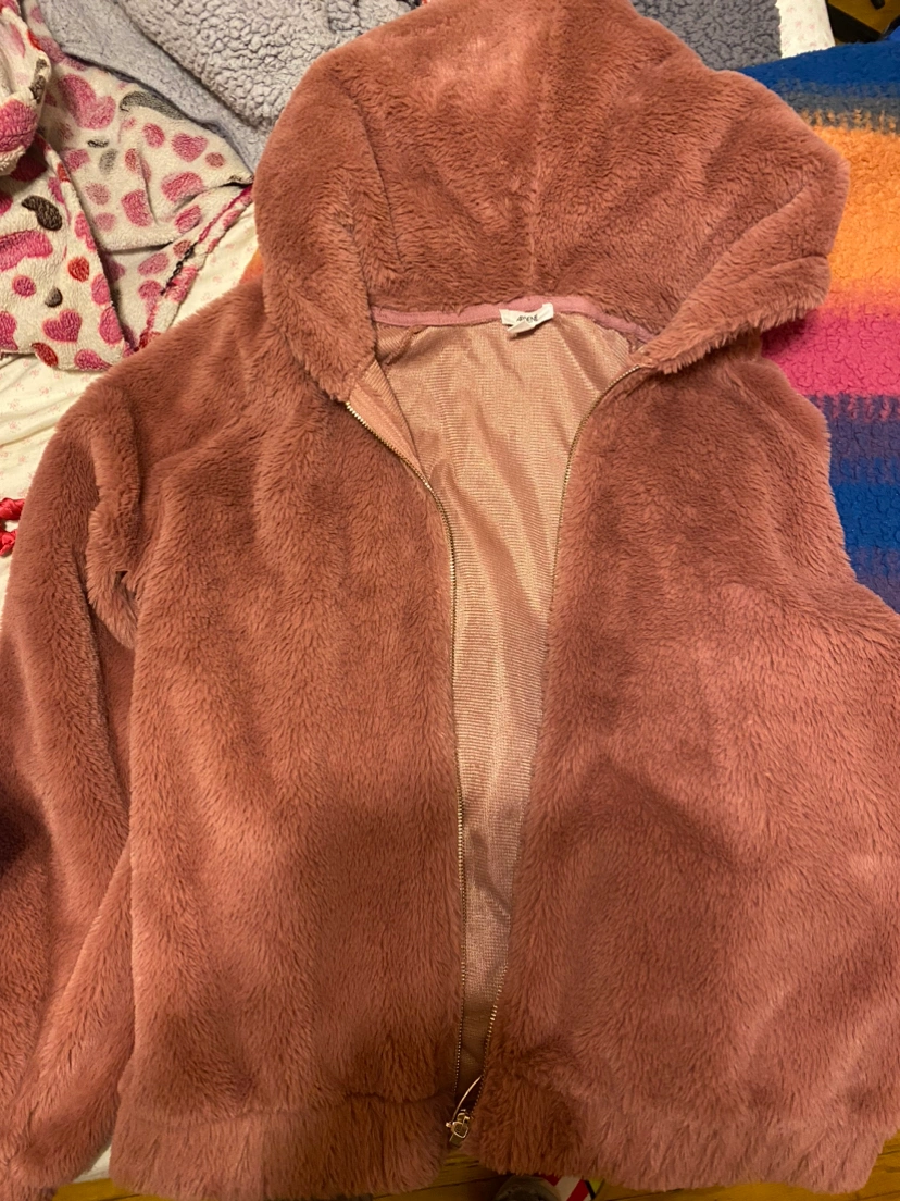 Pink fuzzy jacket, I worn it once, doesn’t really fit me anymore. Is very warm. Size XL.