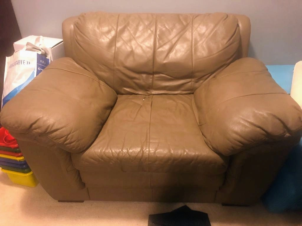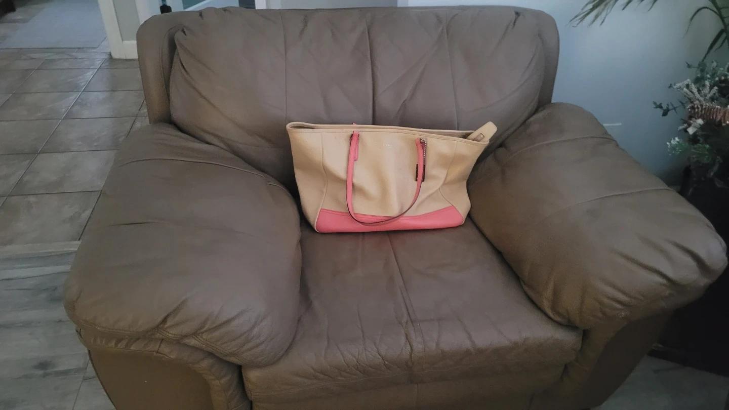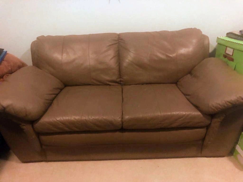 Lowerd all the prices: Can be purchased separately: tan brown real leather couches x3 are available for pick up in Clayton heights area and in a hypoallergenic home with very clean ownership and hardly used currently in family room. update: arm chair and love seat at Clayton address at my mom's and sofa 3 seater in Whalley at my house. Due to space. Please, added photo's. And only serious buyer's. Coloring is bad. But a caramel/tan colour. Picture of chair with purse is closest in colour to original. Pet free..2 peices in Cloverdale have hypoallergenic small dog.