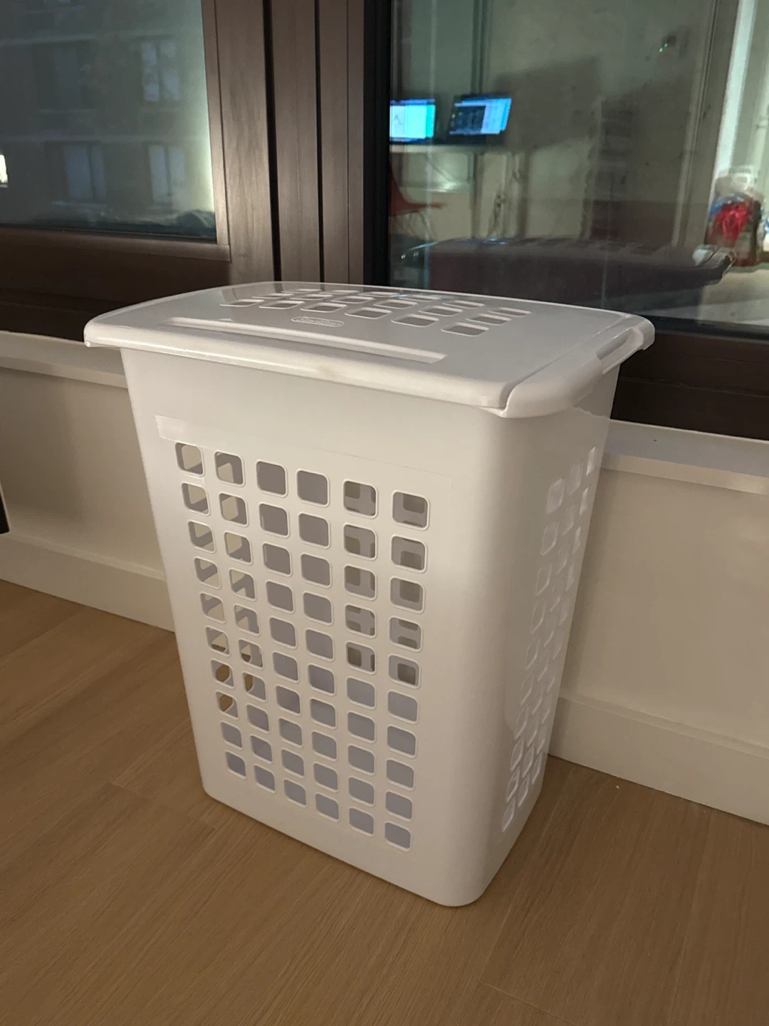 This is a white laundry hamper basket. It's made of plastic and has a lid. The sides are ventilated with square cutouts for airflow. It's a great size for carrying laundry.