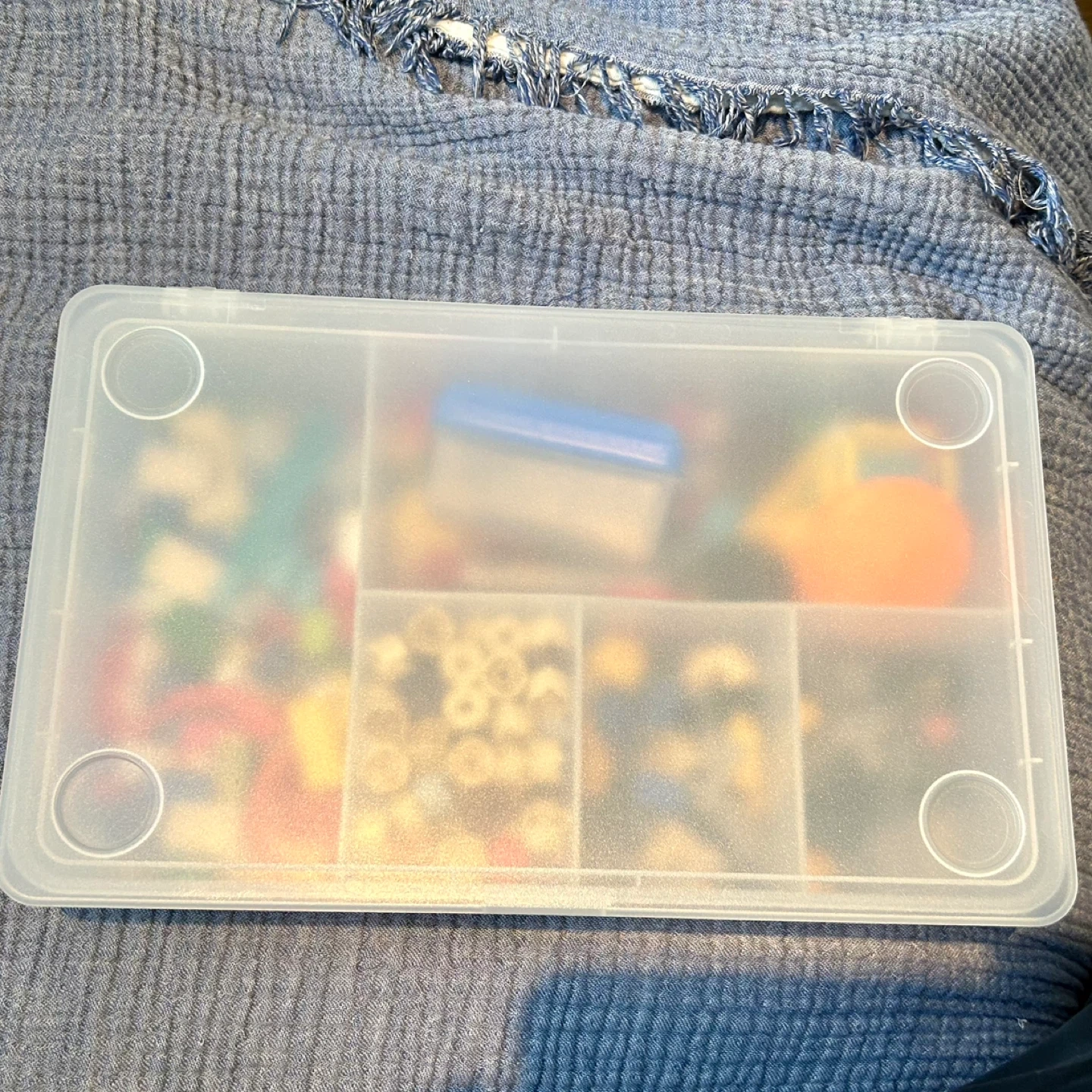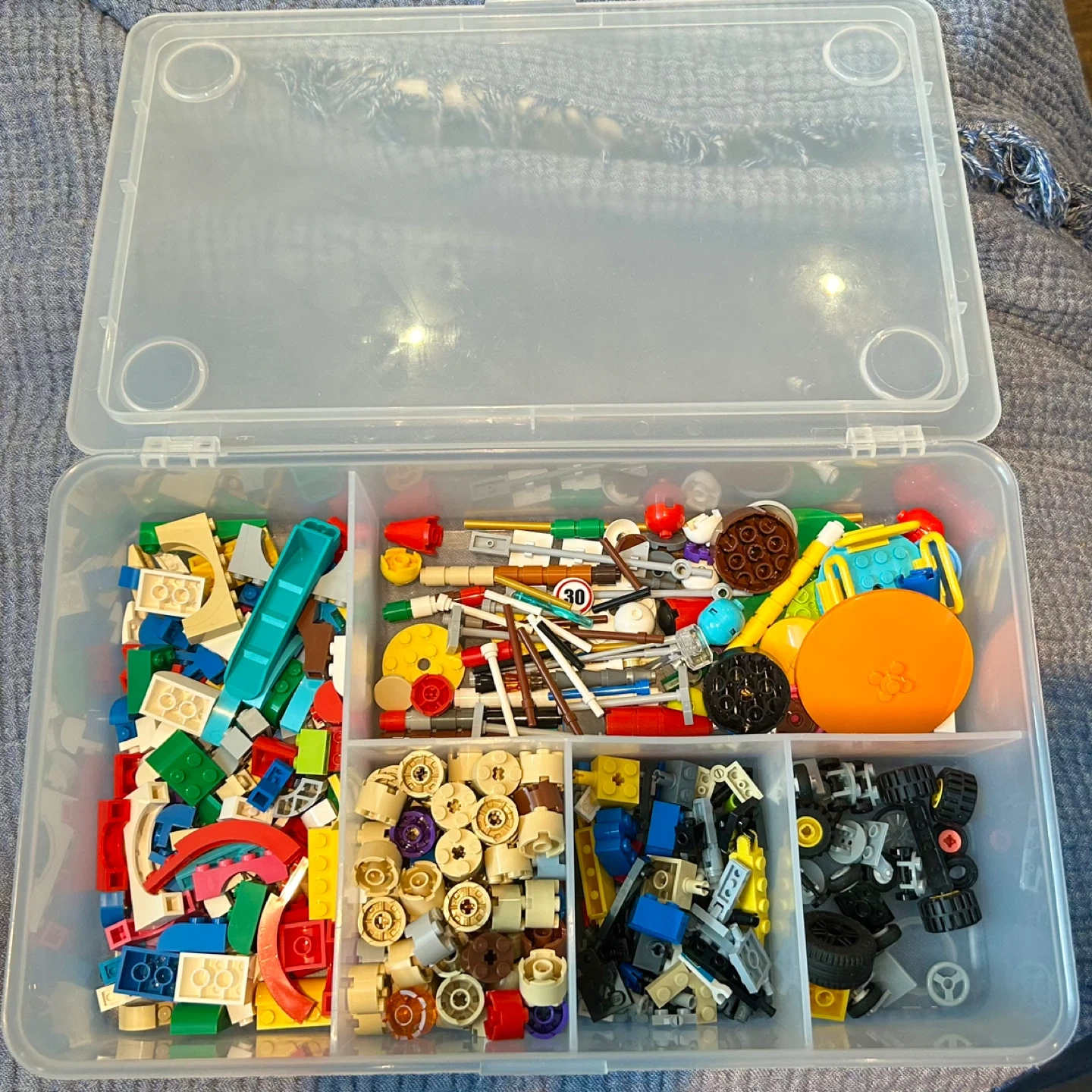 This is a collection of assorted Lego, including wheels, bricks, and various accessories. A clear, compartmentalized storage bin with a lid is sold separately. Perfect for creative building projects!