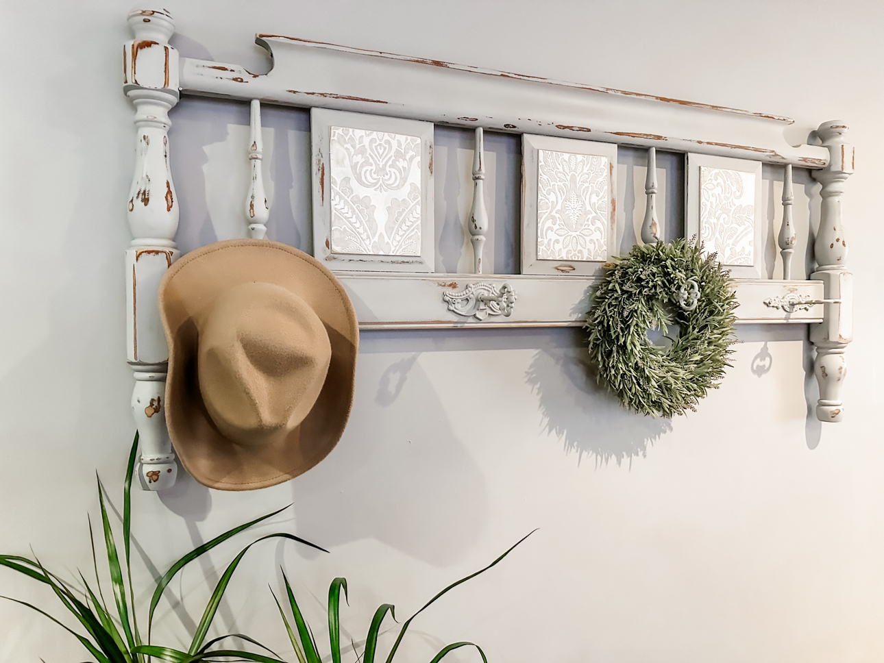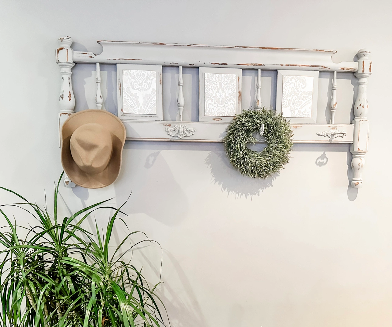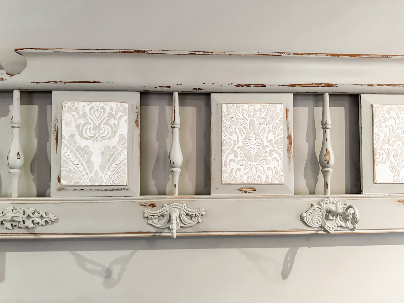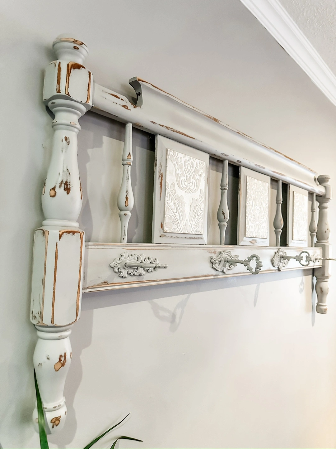 Hand painted and transformed from a footboard, this stunning hanging rack features distinctive iron skeleton key hooks. Ideal for coats, bedroom clothes, or bathroom towels, it's a unique rustic piece that brings charm to your home decor. This piece is solid wood and very sturdy.