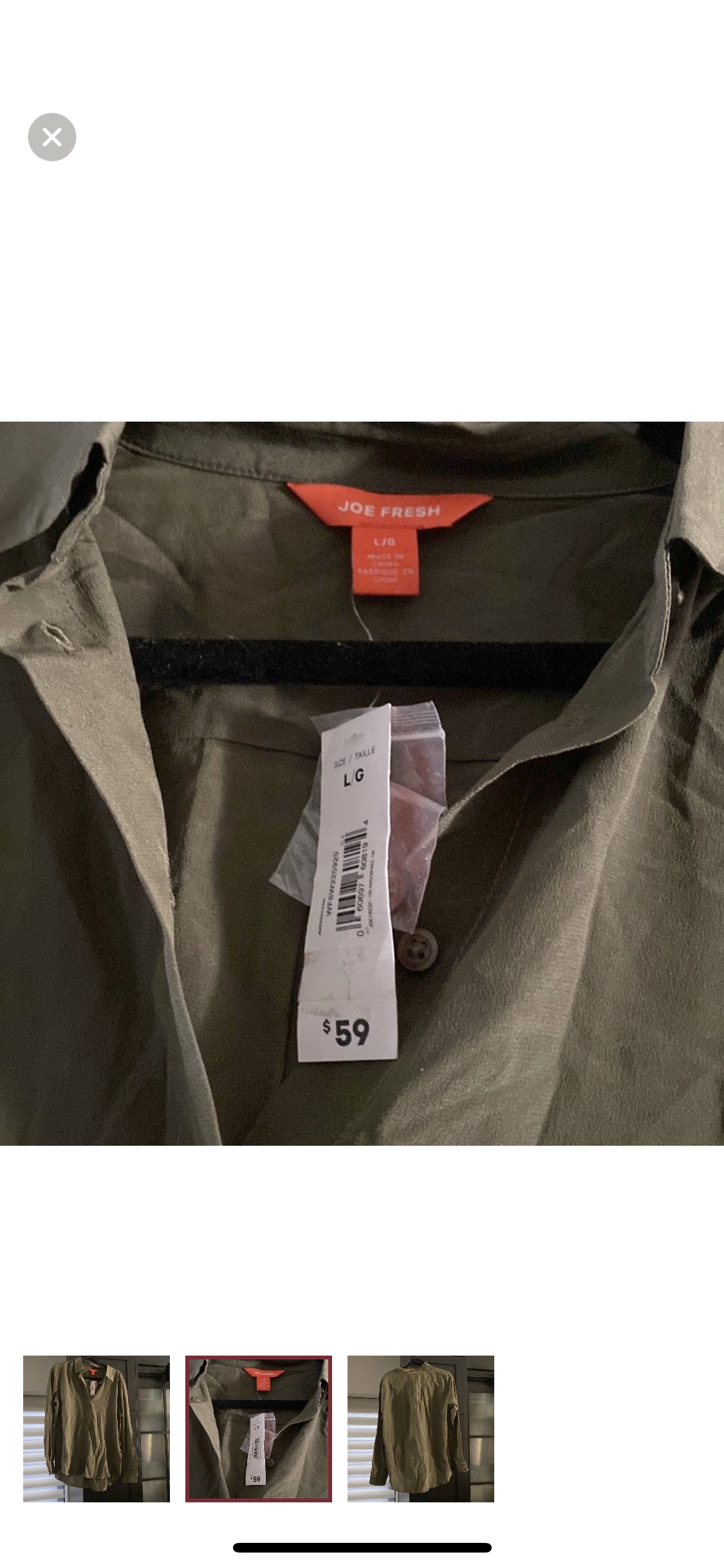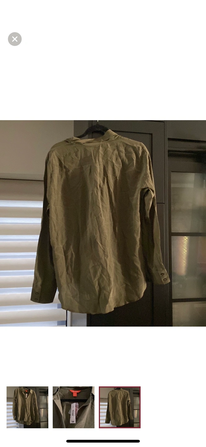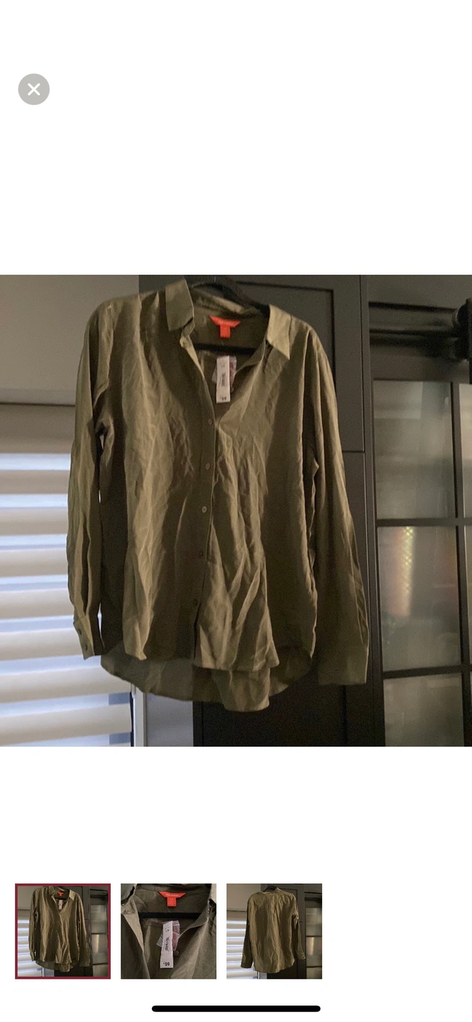 NWT Beautiful Joe Fresh button down silk shirt in a khaki/olive green. Classic style that can be dressed up or worn casually with denim.