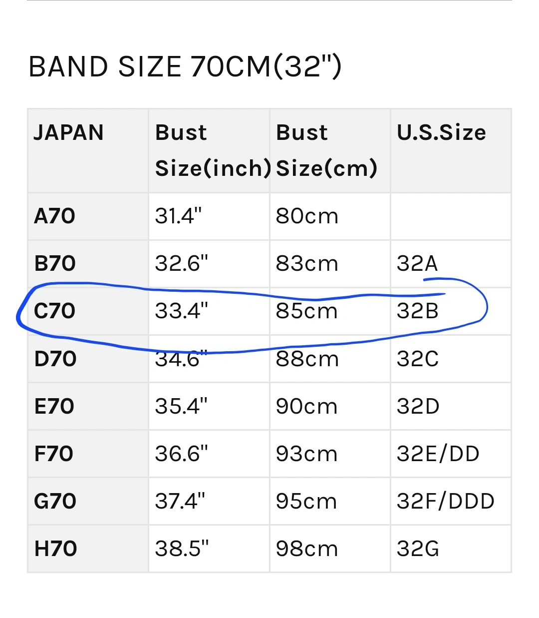 Size is C70 in Asian size, which is equivalent to B32 in US sizing.