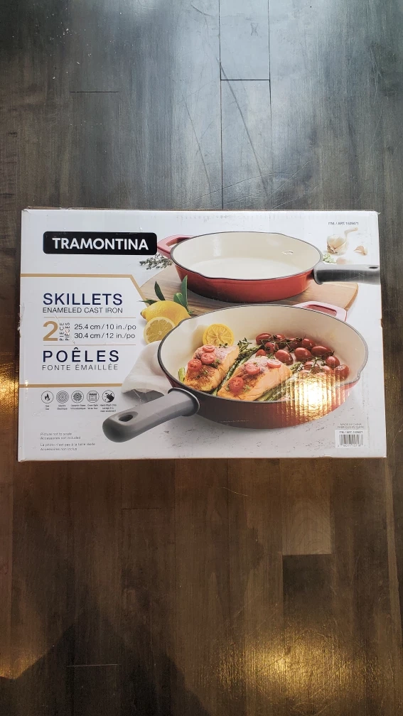 Brand new Tramontina Enameled Cast Iron Pans. Comes with 2 pans. Each has a removable padded handle for easy cleaning and a comfortable grip.