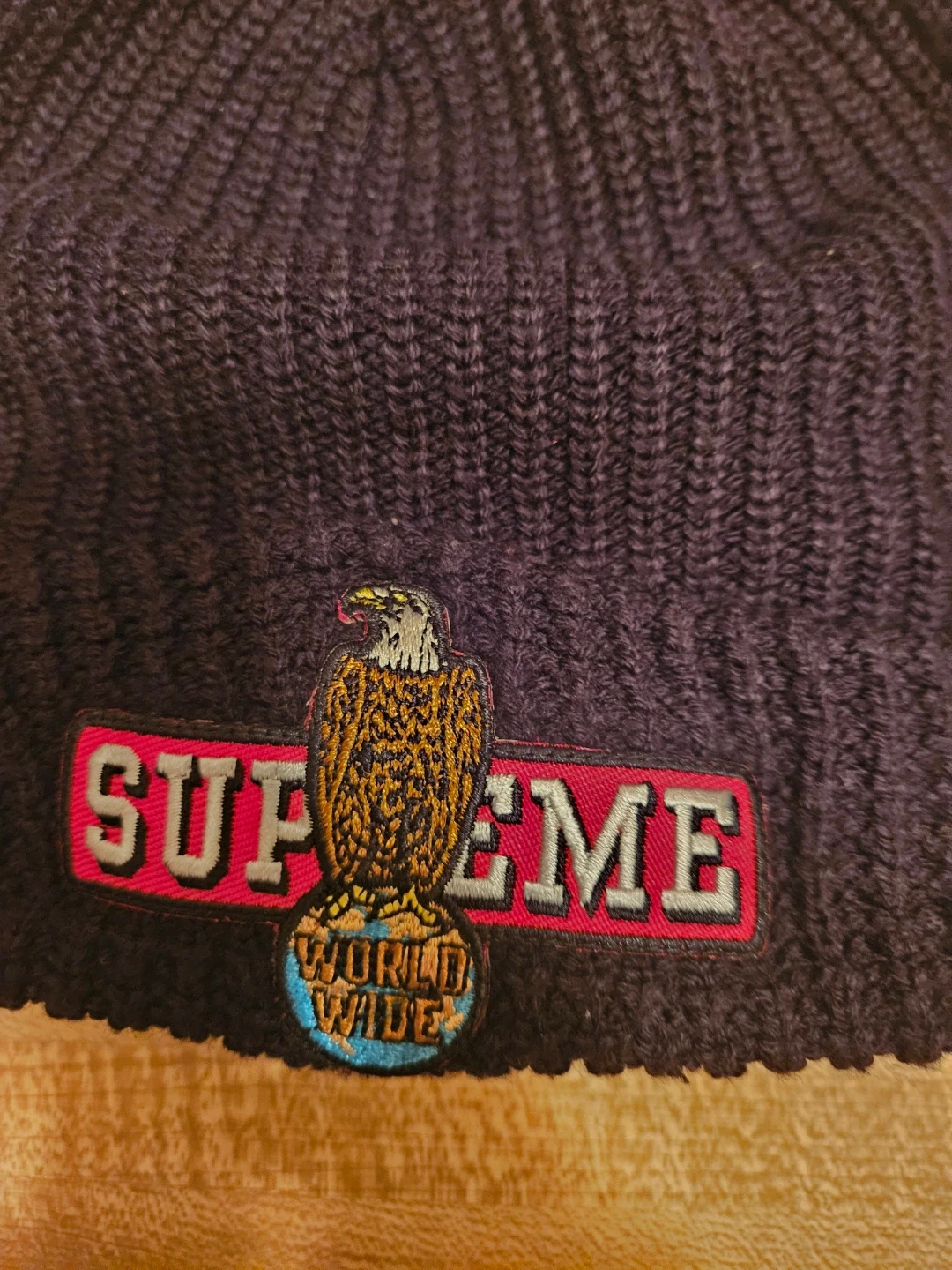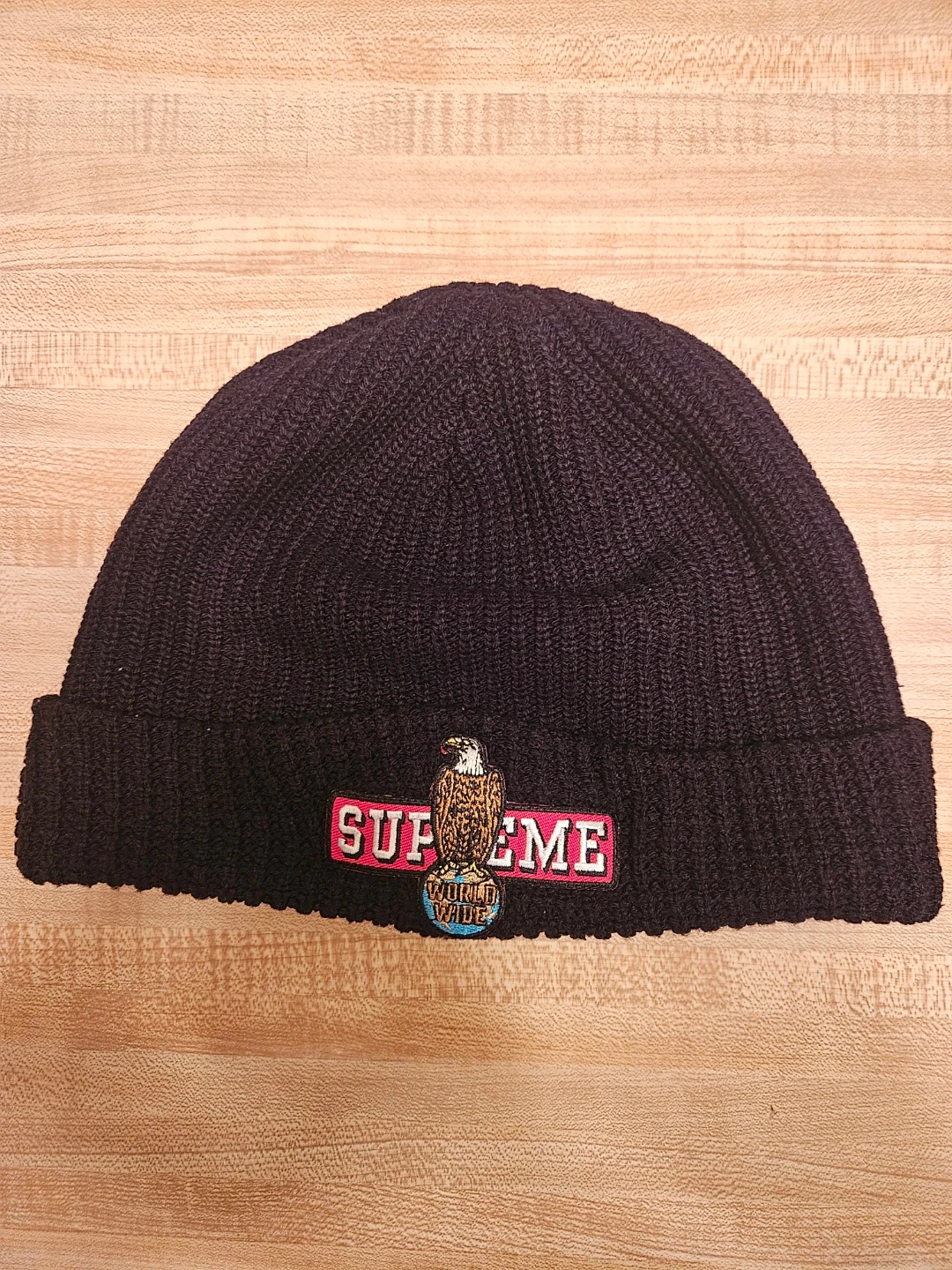 Supreme beanie made from 100% acrylic. Features a 'Supreme World Wide' patch with an eagle graphic. Made in Canada. Hand wash cold only.