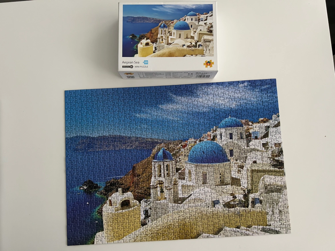 A mini sized 1000-piece puzzle featuring a great view of Santorini. Excellent condition, no missing pieces.