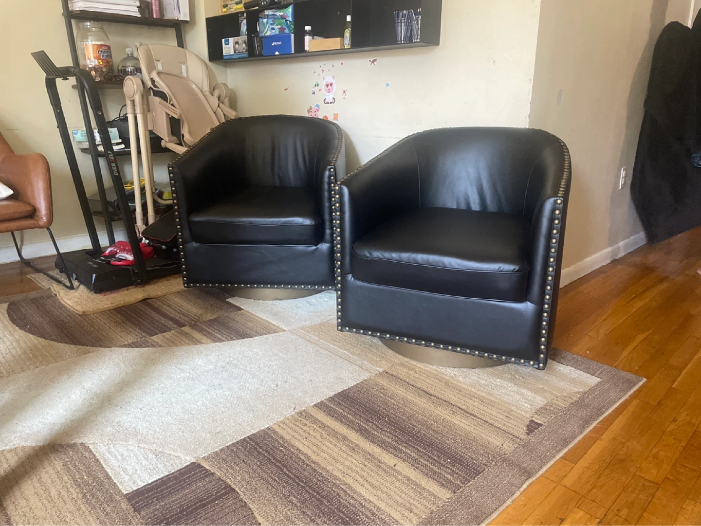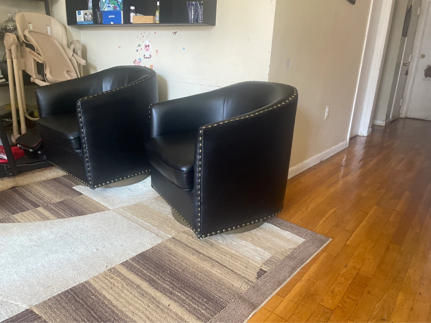 Buy & SellSet of 2 Black Faux Leather Barrel ChairsSet of 2 Black Faux Leather Barrel Chairs$187Two black faux leather barrel chairs with brass nailhead trim. They feature a swivel base and a curved backrest. Perfect for a living room or den!ConditionGoodWHERE TO MEETBrookView MapSELLERverifiedJosselynMelrose600 reviews3 chats·6 favorites·122 viewsSEND CHAT TO SELLERHi Josselyn! I’m interested in your listing.Hi Josselyn! I’m interested in your listing.Get the Karrot app to chatSign In to chat